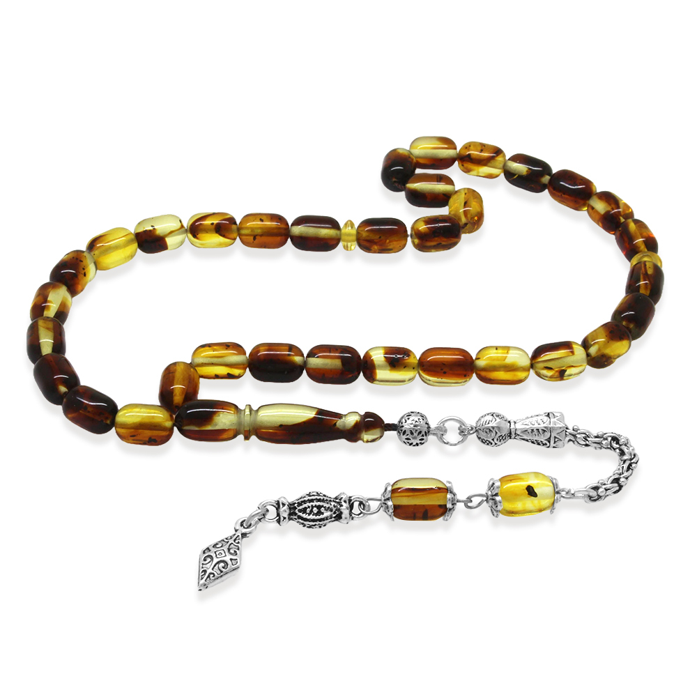 Fosilli Beyrut Kehribar Tesbih - Kararmaz Metal Püsküllü - Sarı Siyah - Kapsül Kesim