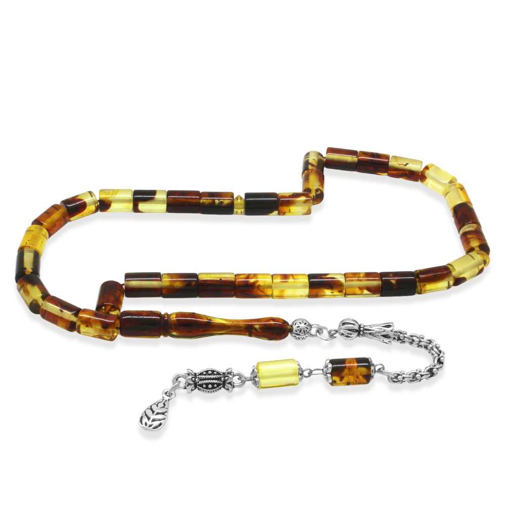Fosilli Beyrut Kehribar Tesbih - Kararmaz Metal Püsküllü - Sarı Siyah - Kesme Kesim