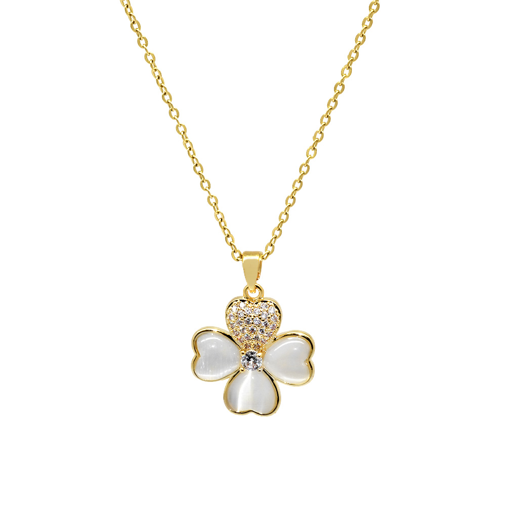 Altın Renk Beyaz Zirkon Taş Süslemeli Kalp Detaylı Yonca Yaprağı Tasarım Çelik Kadın Kolye