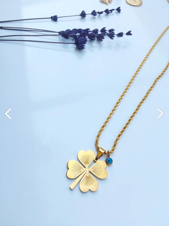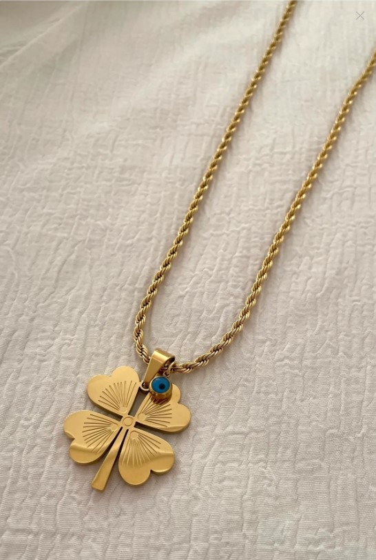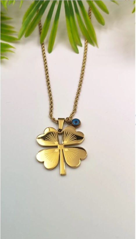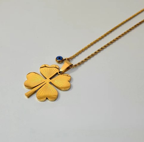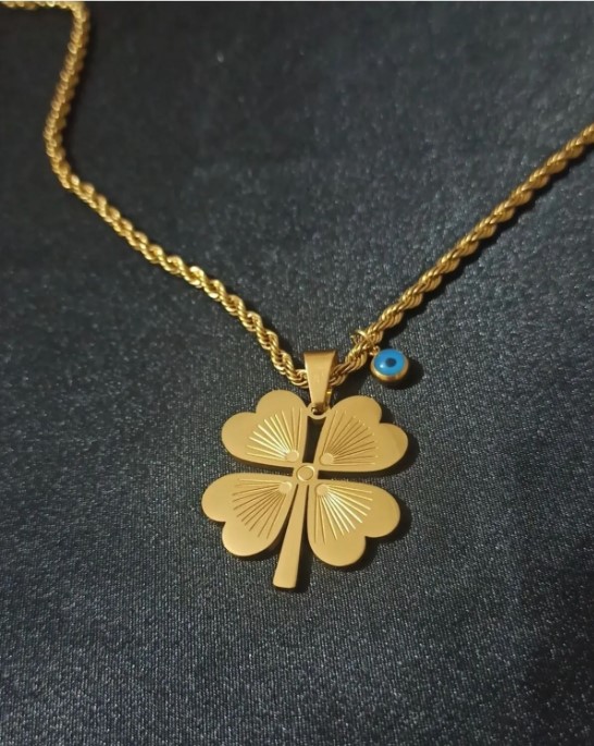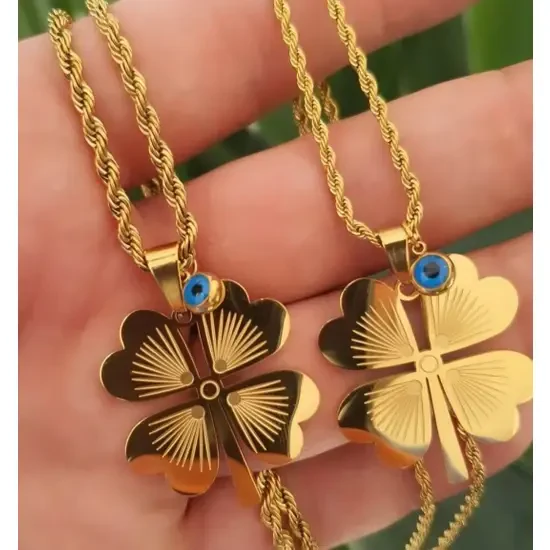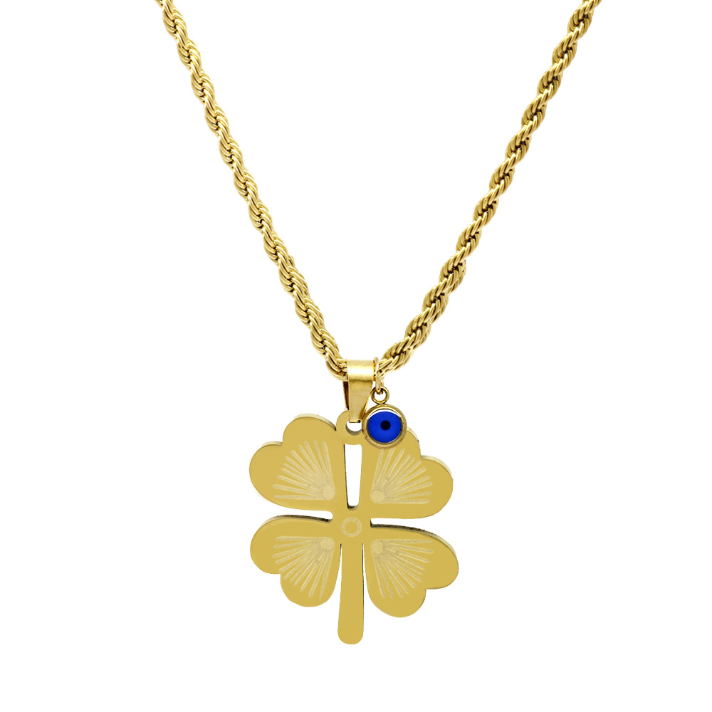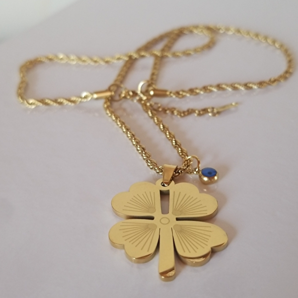 Altın Renk Burma Zincirli Nazar Boncuğu Detaylı Yonca Yaprağı Tasarım Çelik Kadın Kolye
