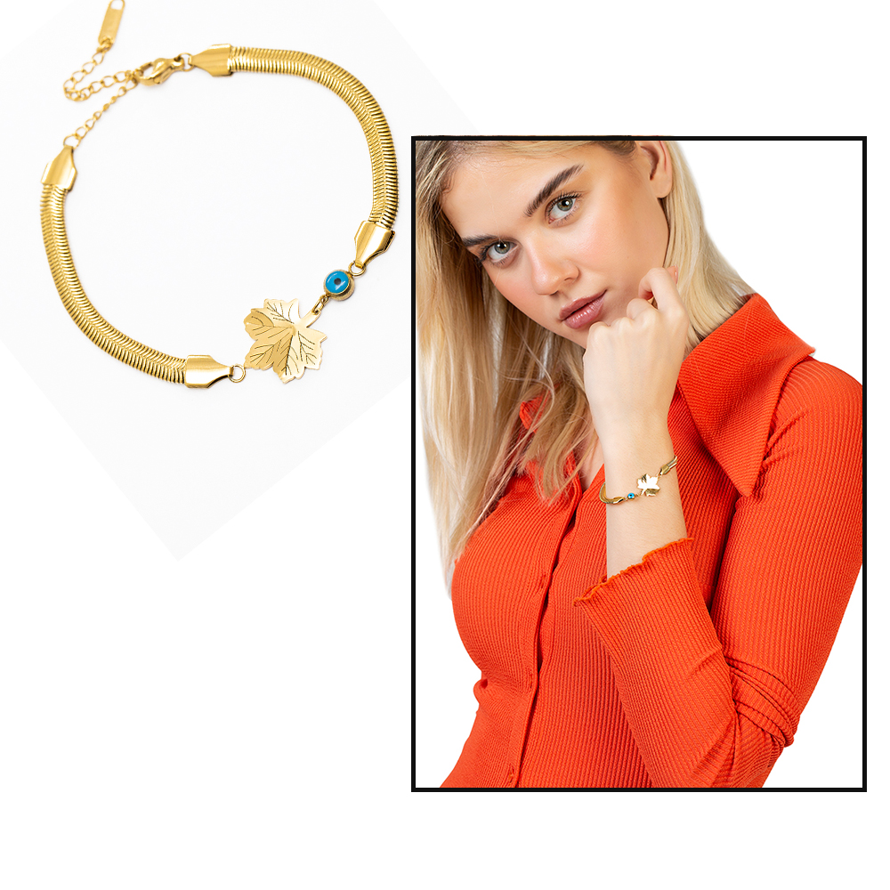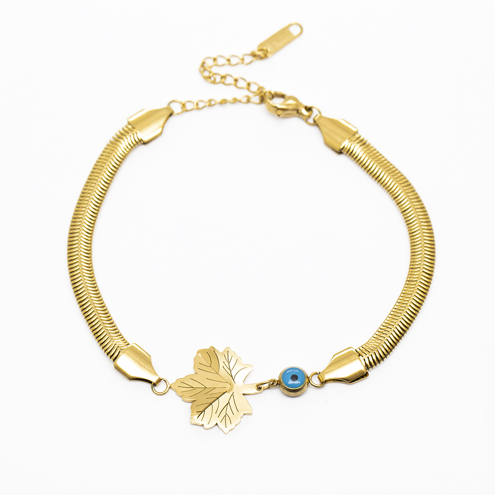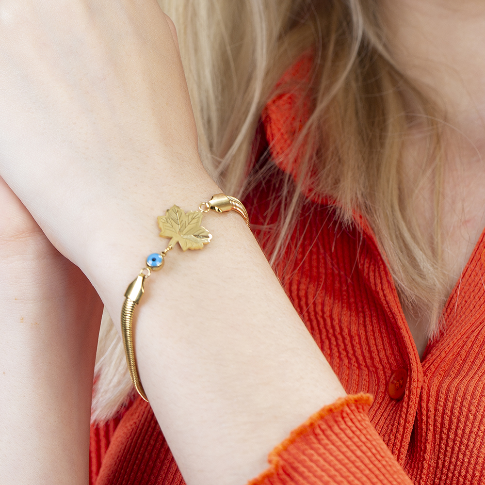 Altın Renk Kararmaz Metal Snake Zincirli Çınar Yaprağı Tasarım Nazar Boncuğu Detaylı Kadın Bileklik