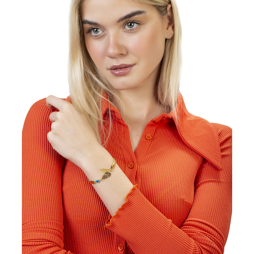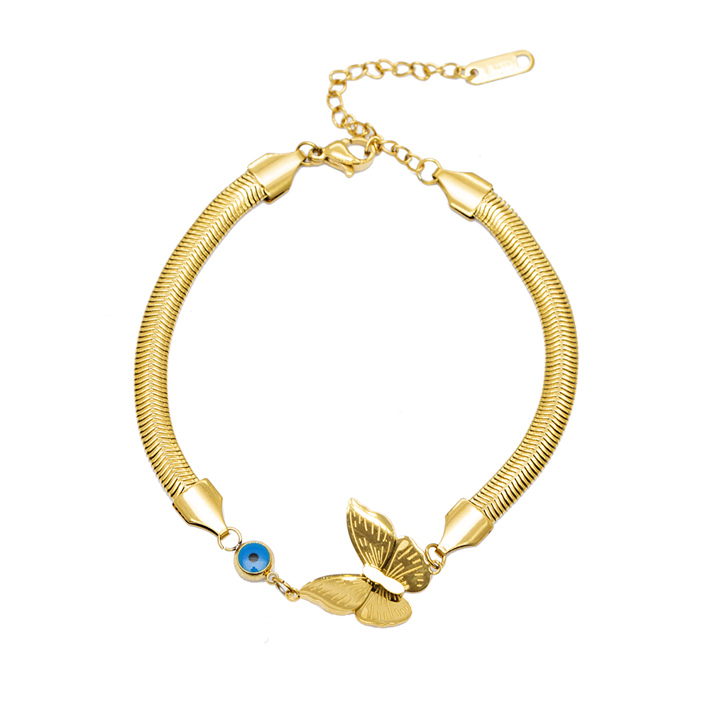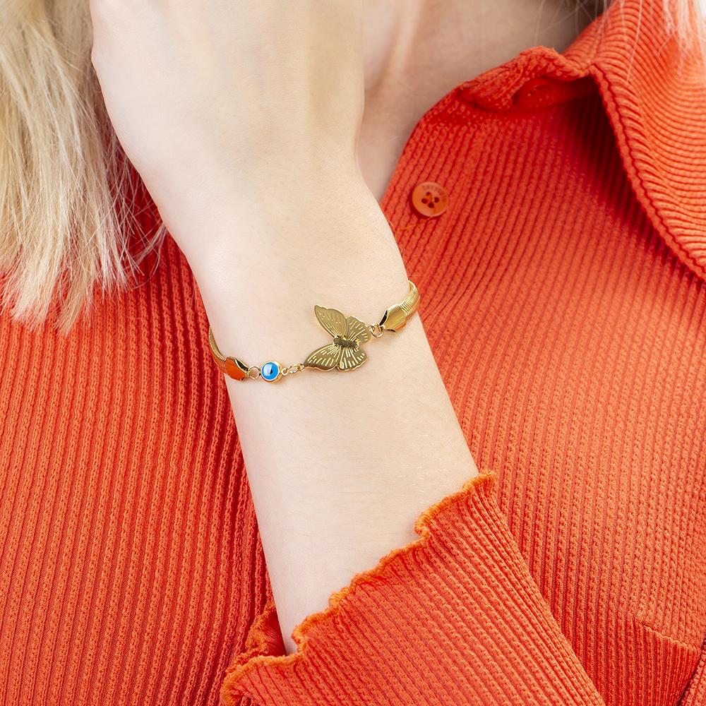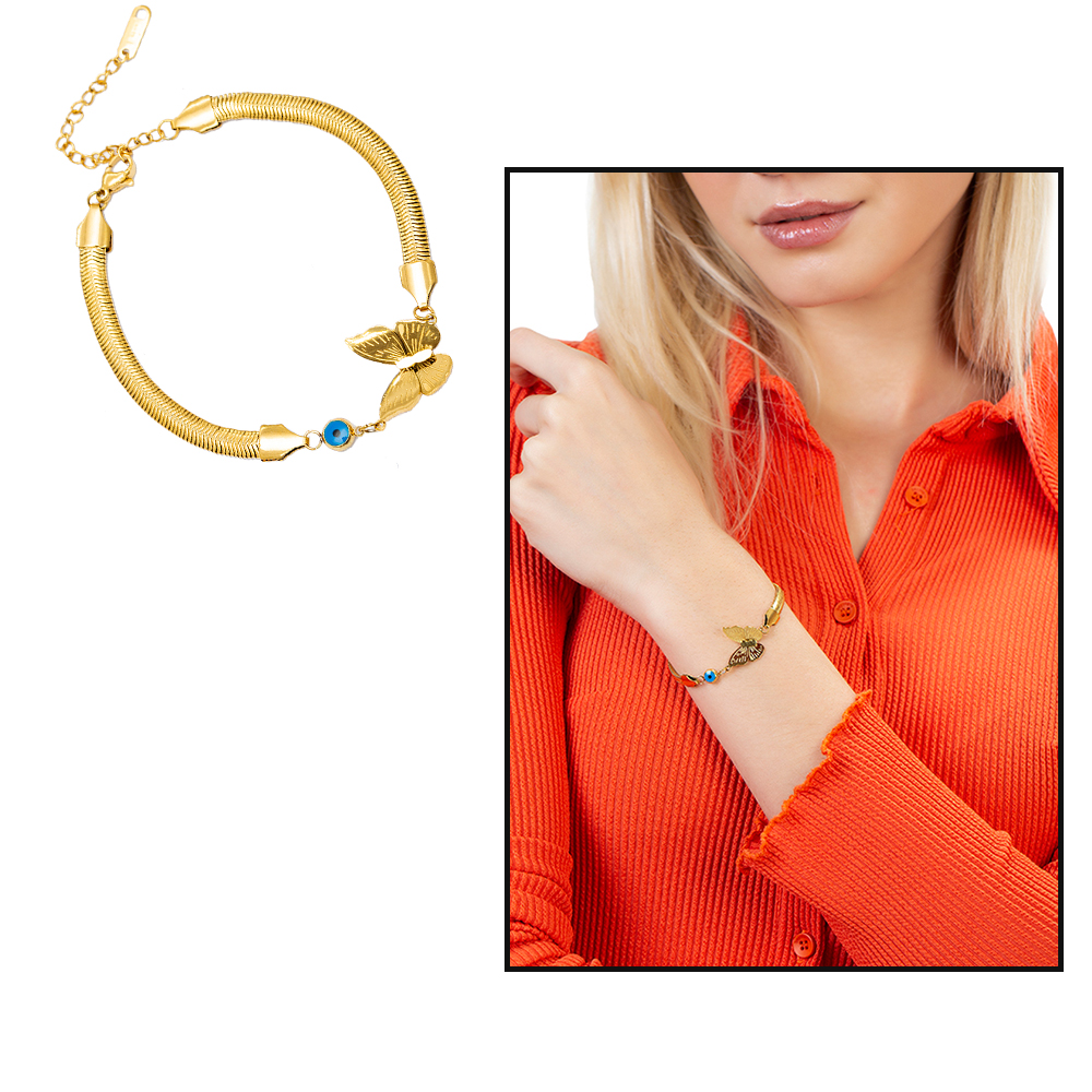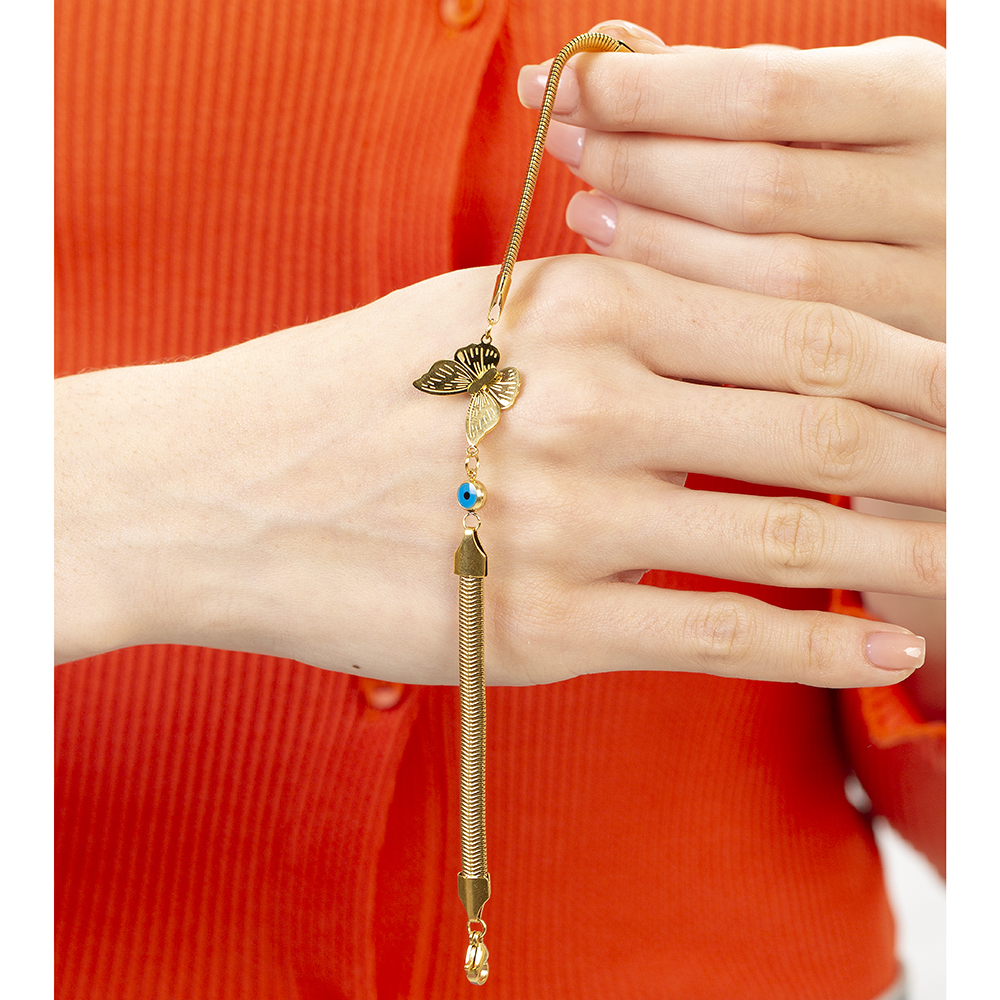 Altın Renk Kararmaz Metal Snake Zincirli Kelebek Tasarım Nazar Boncuğu Detaylı Kadın Bileklik