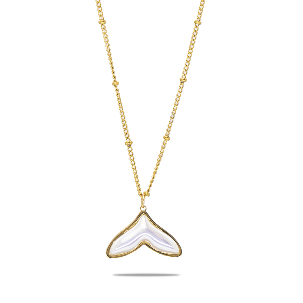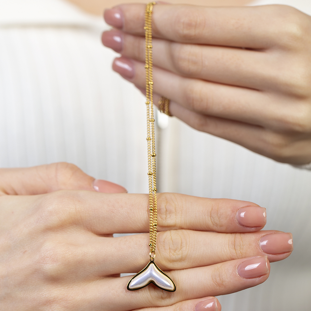 Altın Renk Kararmaz Metal Zincirli Balina Kuyruğu Tasarım İnci Doğaltaş Kombinli Kadın Kolye