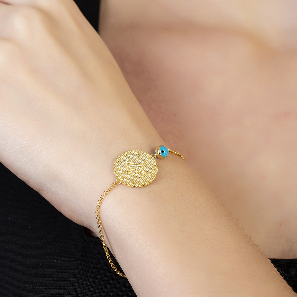 Altın Renk Mecidiye Tasarım Nazar Boncuğu Detaylı 925 Ayar Gümüş Kadın Bileklik