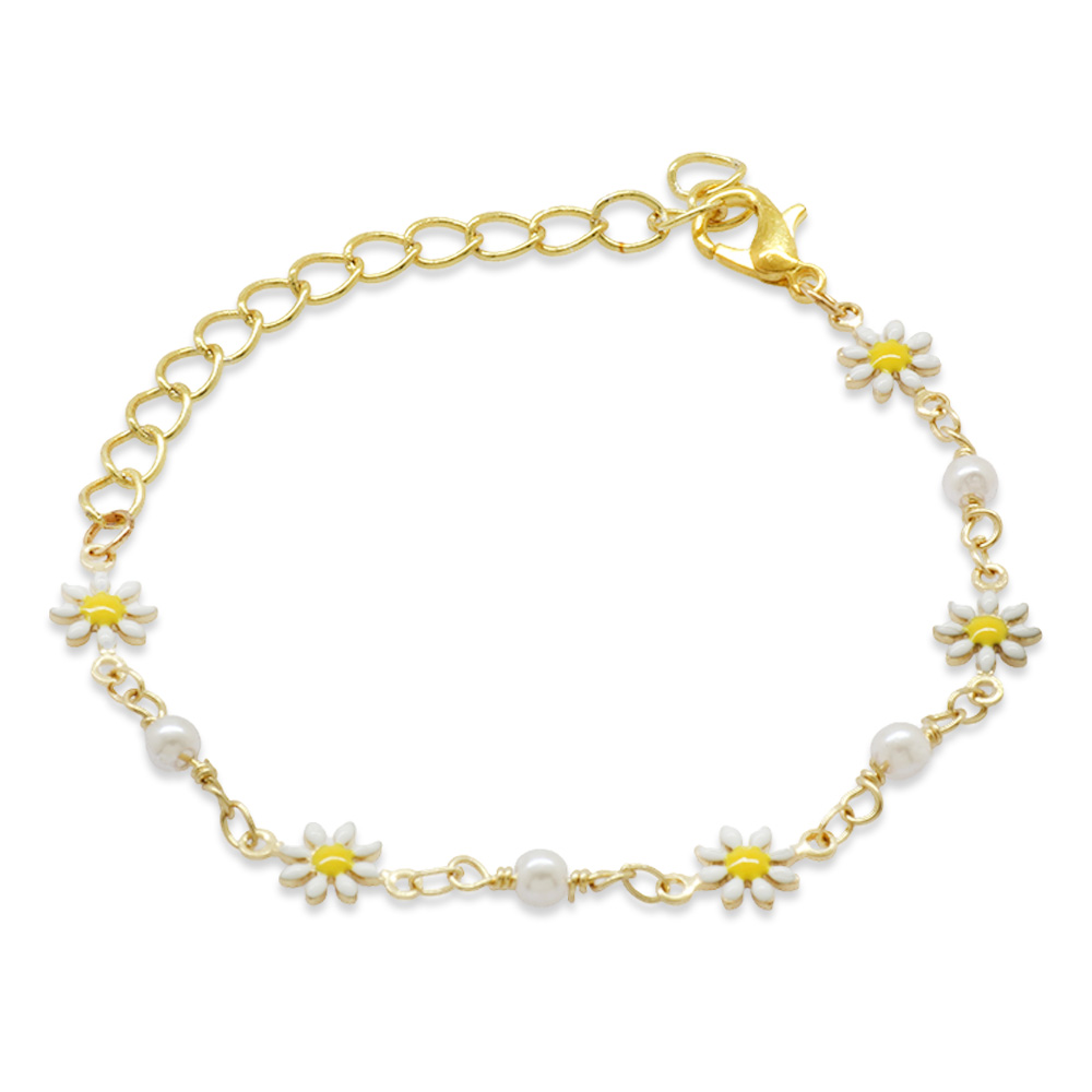 Altın Renk Metal Zincirli İnci Süslemeli Kır Çiçeği Detaylı Kadın Bileklik