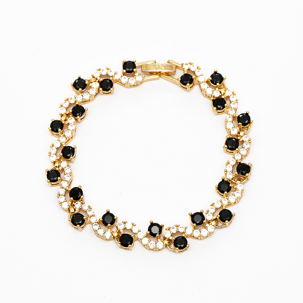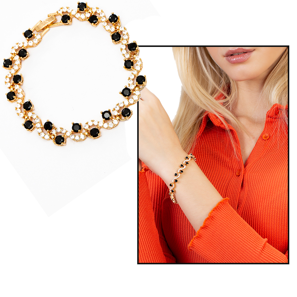 Altın Renk Siyah Beyaz Zirkon Taşlı Tam Tur Çelik Kadın Bileklik