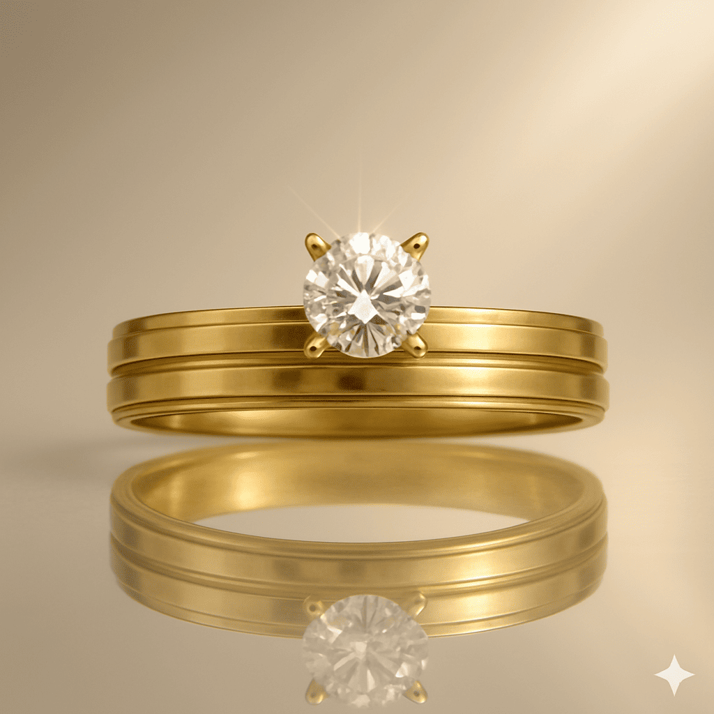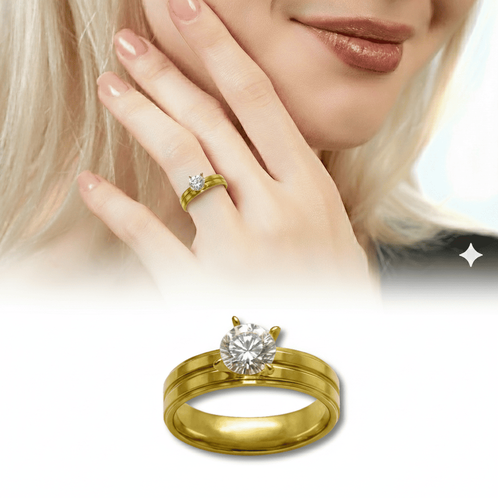 Altın Renk Zirkon Taşlı V Tasarım 316L Kalite Paslanmaz Çelik Kadın Tektaş Yüzük - 25 Ölçü