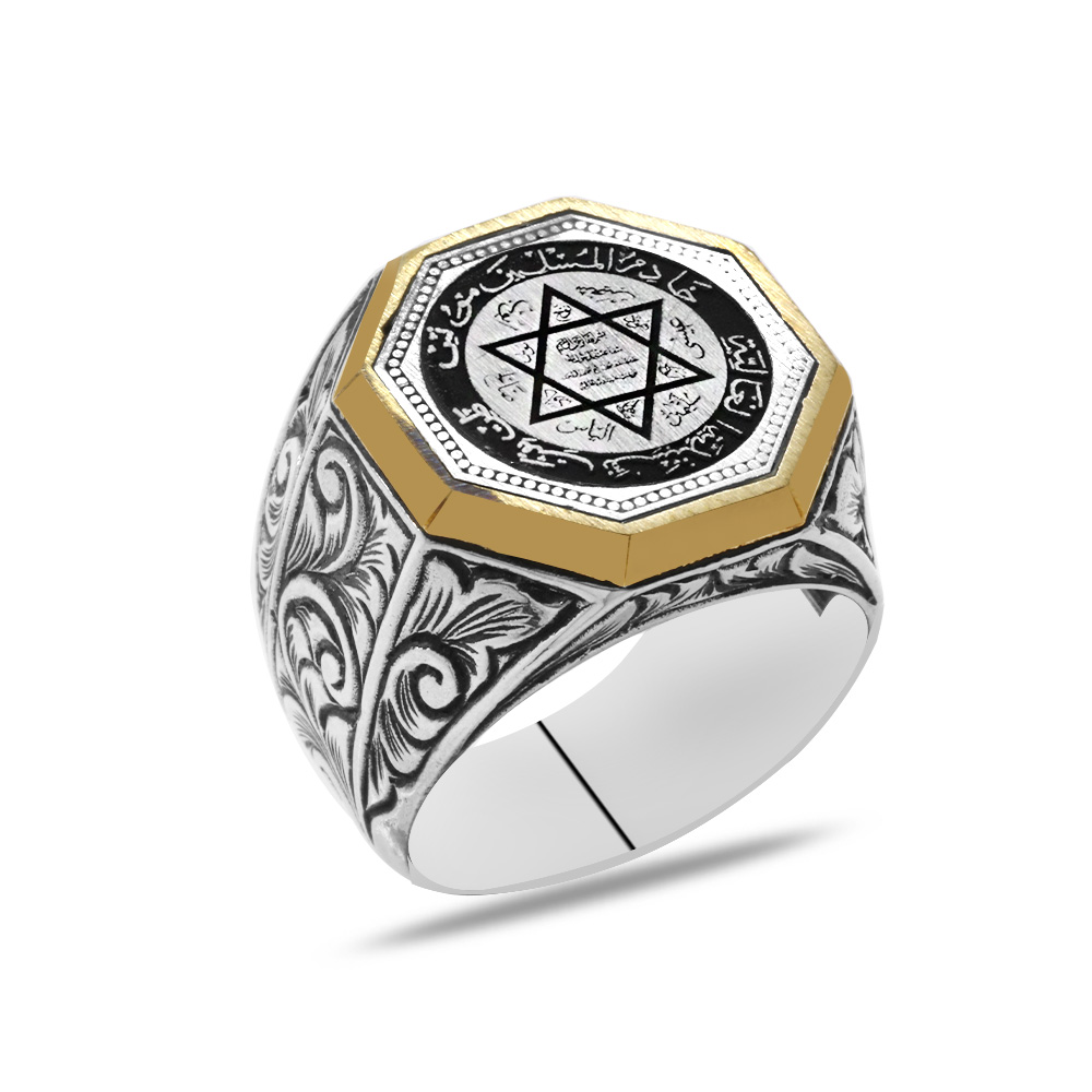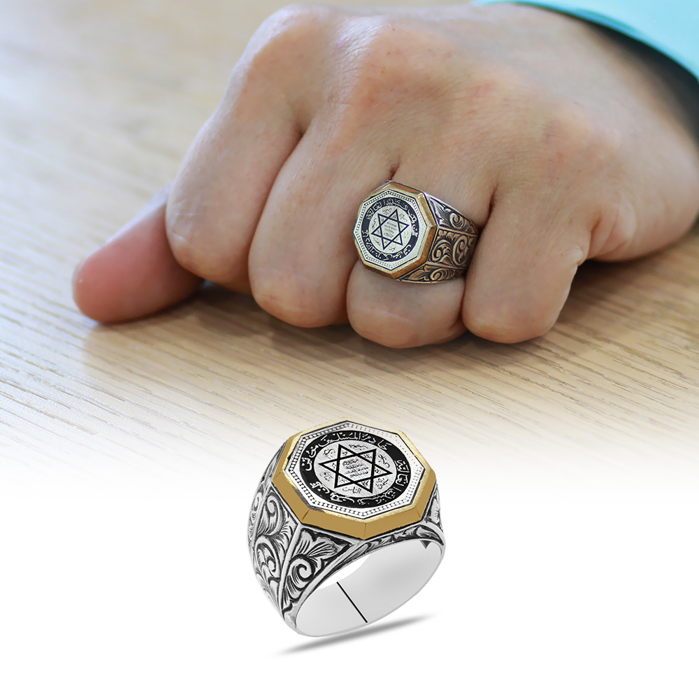 Gravür Desenli Mührü Süleyman İşlemeli Sekizgen Tasarım 925 Ayar Gümüş Erkek Yüzük