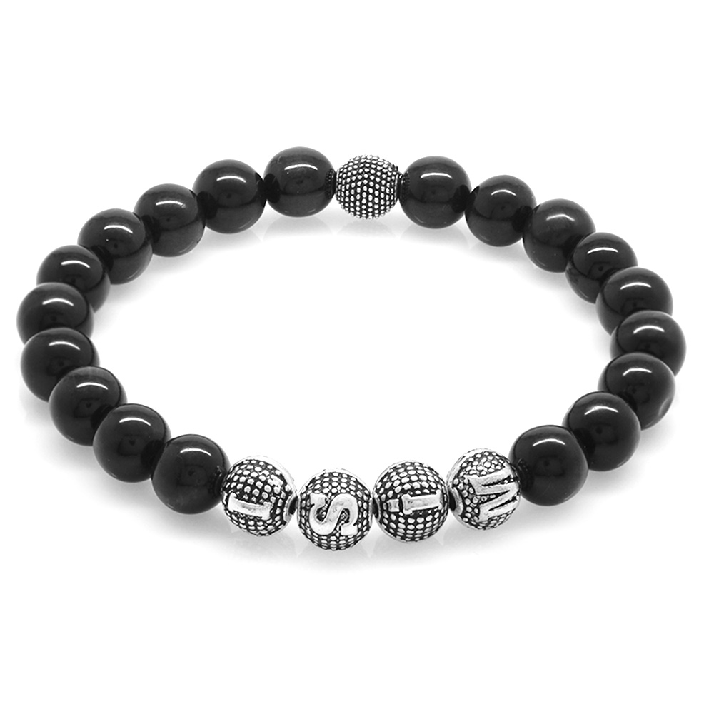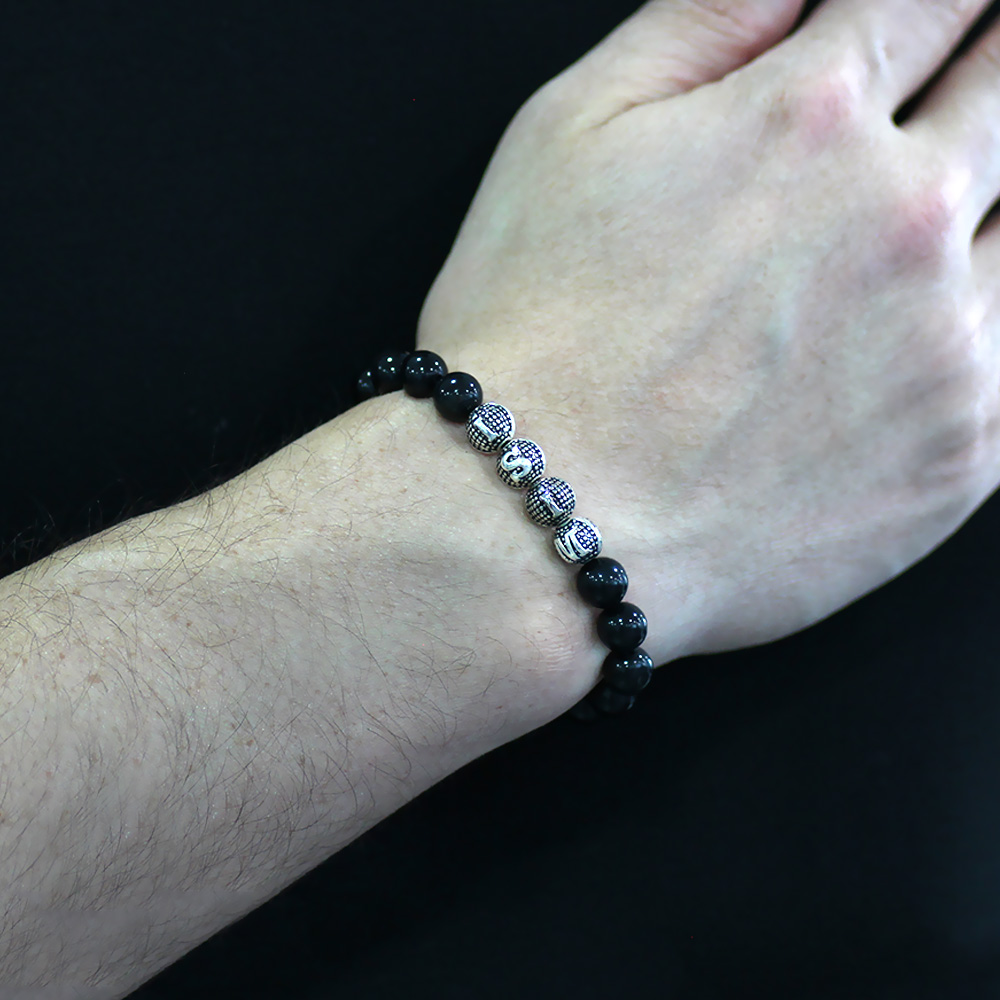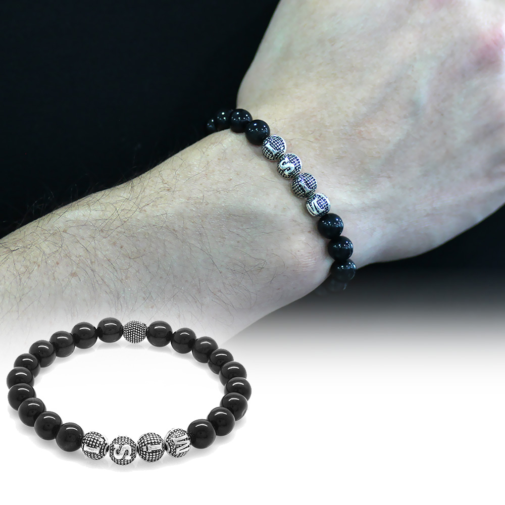 Gri Kaplan Gözü Doğaltaş Bileklik - İsme Özel Yazılı - Metal Kombinli - Küre Kesim