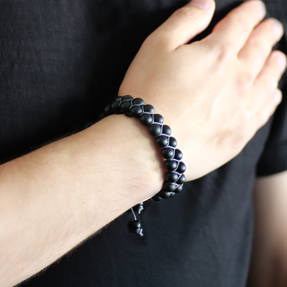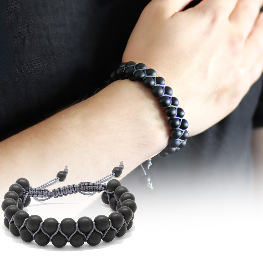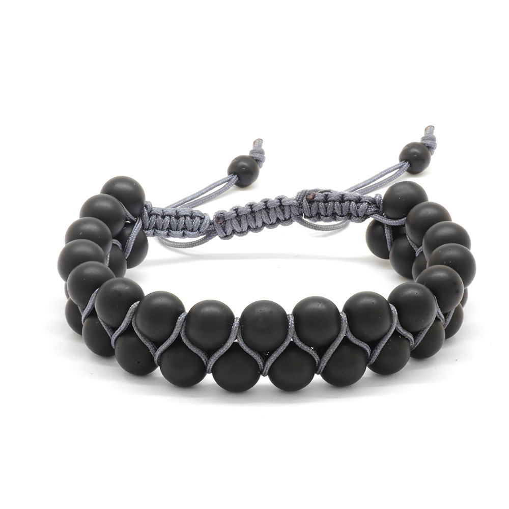 Gri Makrome Örgülü Küre Kesim Çift Sıralı Oniks Doğaltaş Bileklik