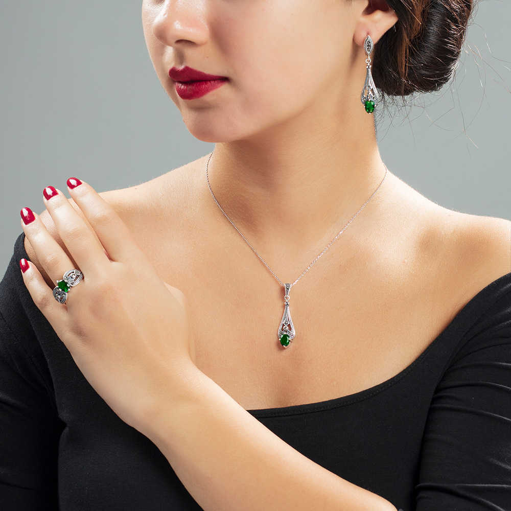 Yeşil Green Glass Taşlı 925 Ayar Gümüş 3 lü Takı Seti - 1