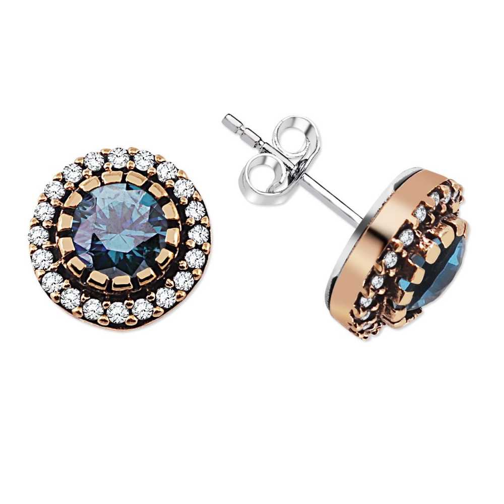 Mavi Zirkon Taşlı Yuvarlak Tasarım 925 Ayar Gümüş Küpe - 2