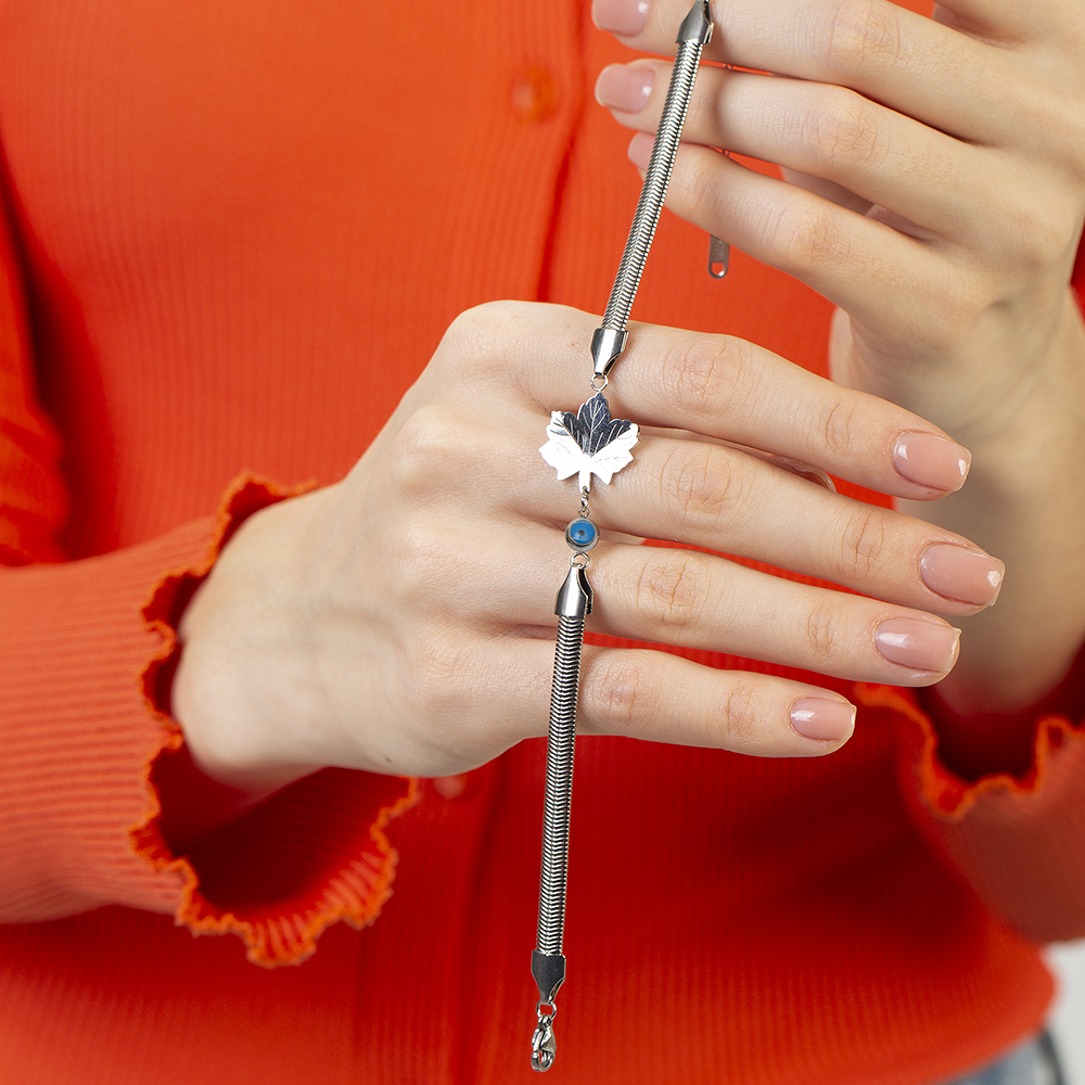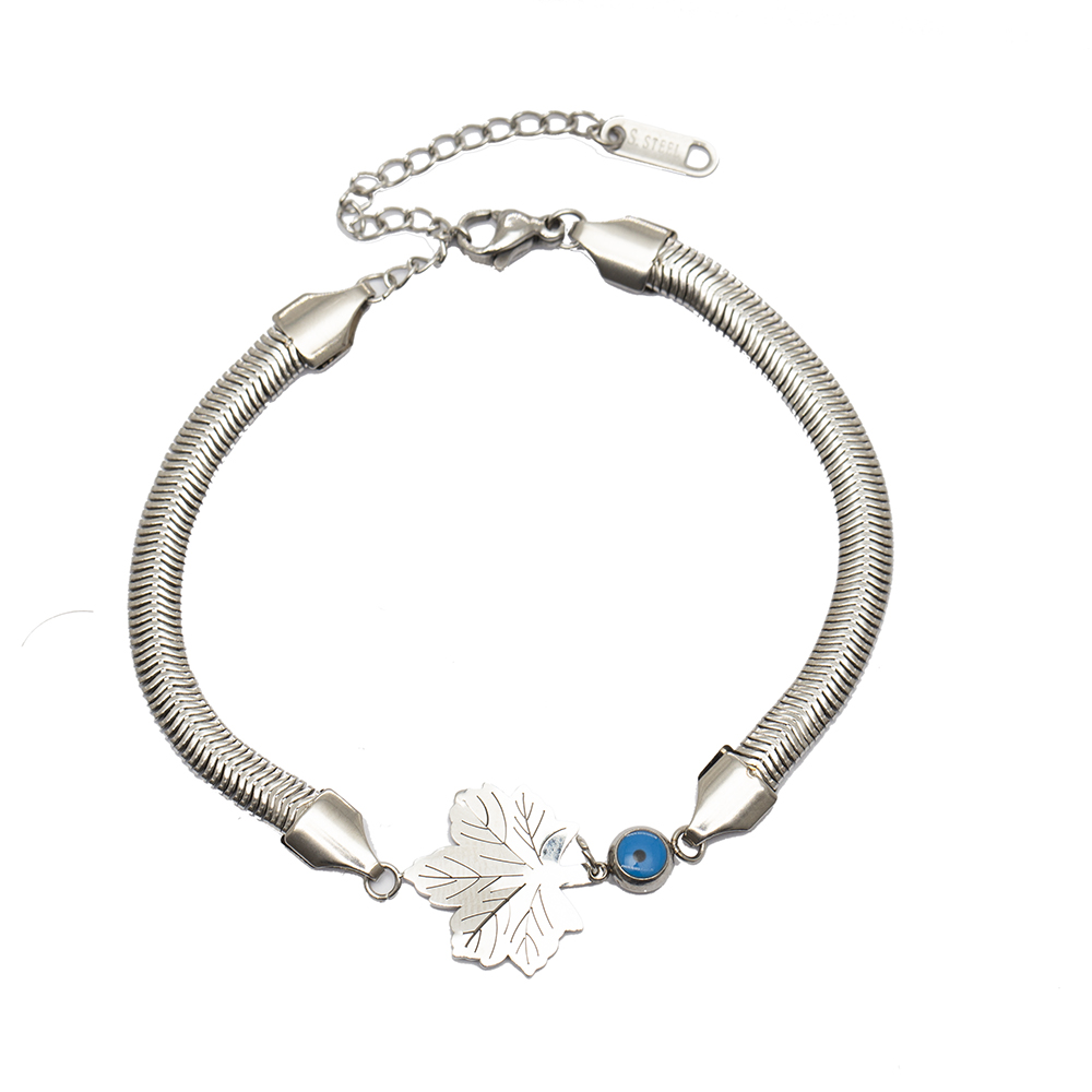 Gümüş Renk Kararmaz Metal Snake Zincirli Çınar Yaprağı Tasarım Nazar Boncuğu Detaylı Kadın Bileklik