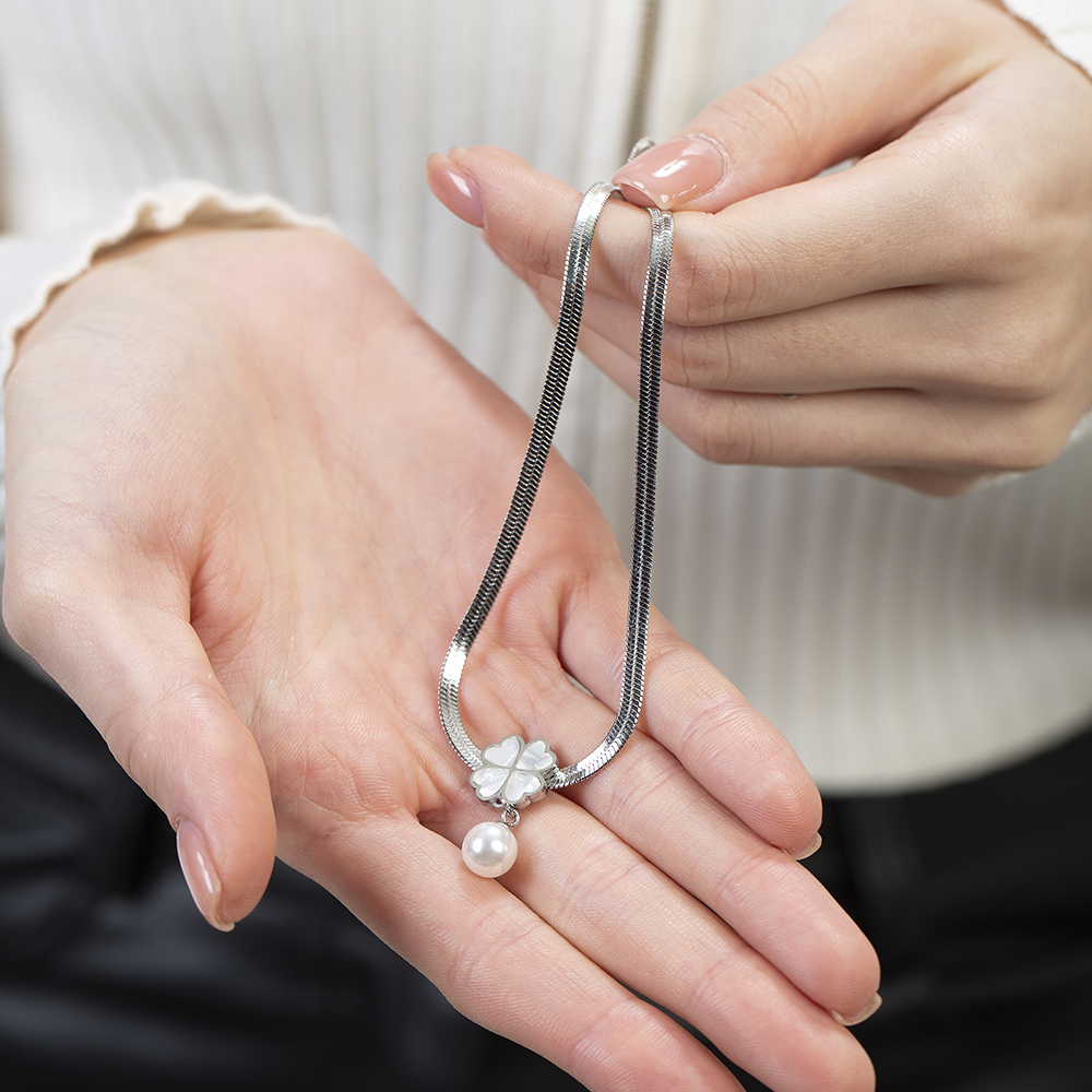 Gümüş Renk Kararmaz Metal Snake Zincirli Sedef Taşlı Yonca Yaprağı Detaylı İnci Doğaltaş Kadın Kolye