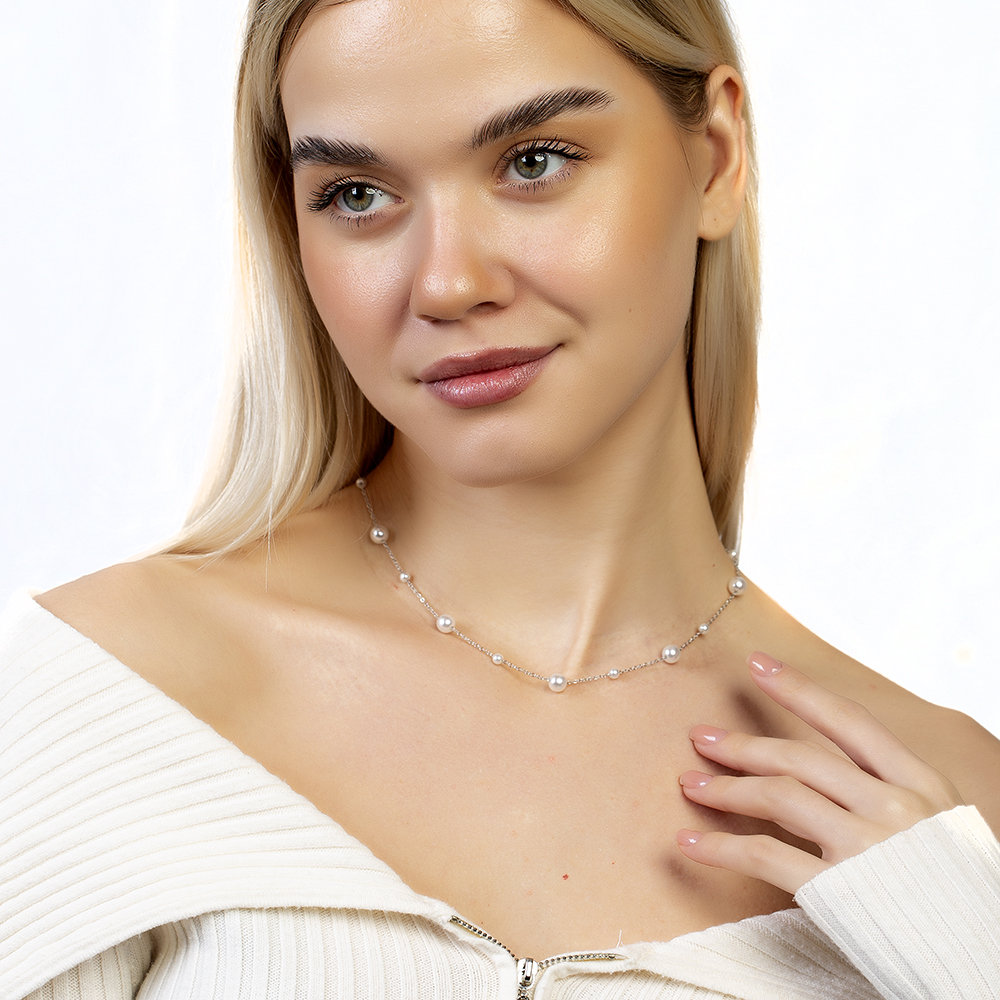 Gümüş Renk Kararmaz Metal Zincirli İnci Doğaltaş Kombinli Kadın Kolye - 6