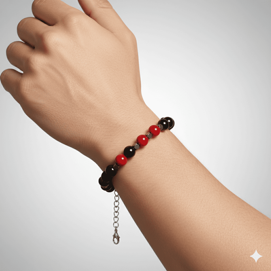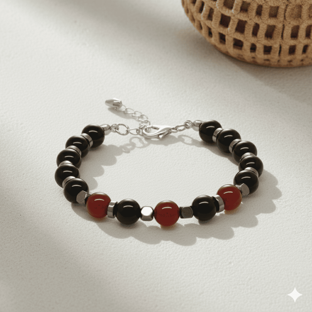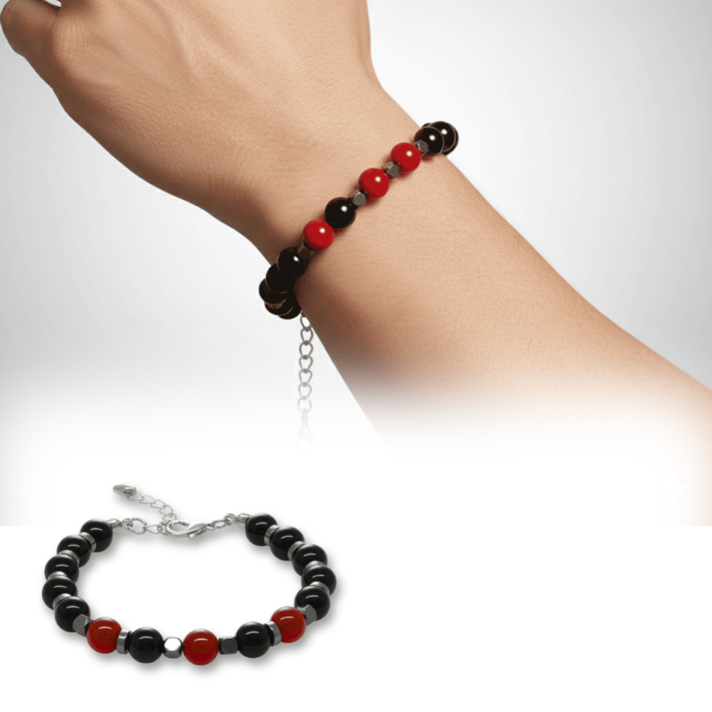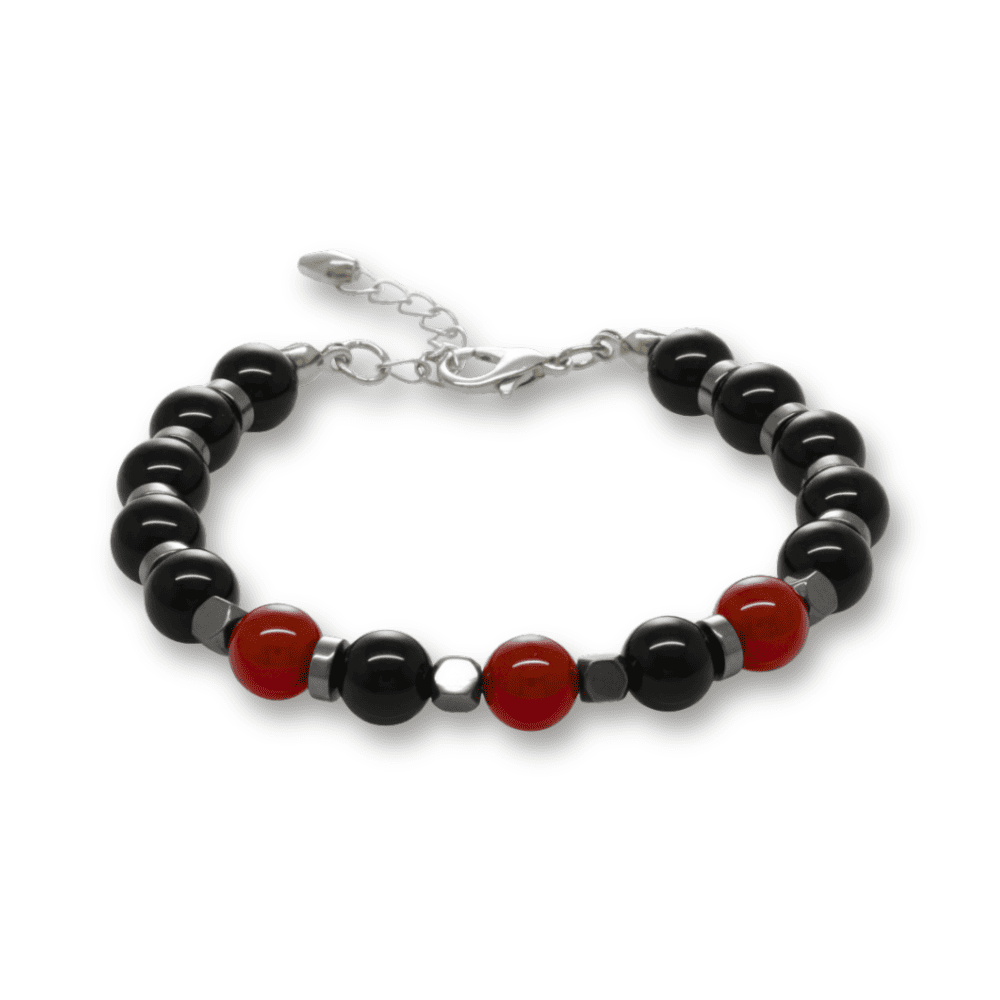 Gümüş Renk Metal Zincir Küre Kesim Kırmızı Siyah Akik Oniks Hematit Doğaltaş Erkek Taraftar Bileklik