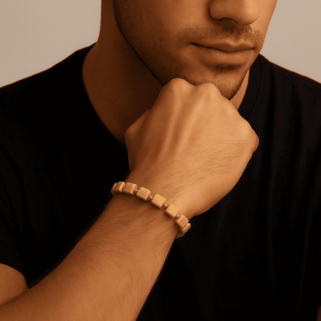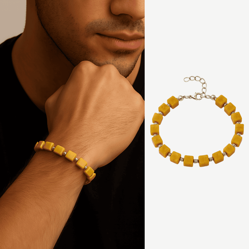 Gümüş Renk Metal Zincir Dorika Süslemeli Küp Kesim Hardal Rengi Doğal Damla Kehribar Erkek Bileklik