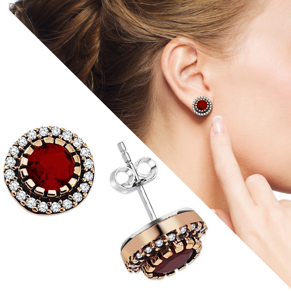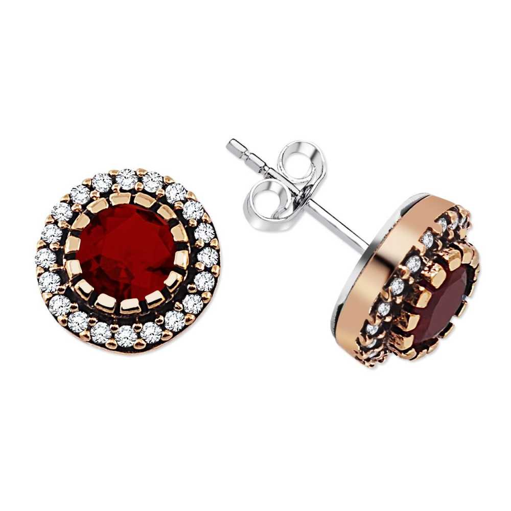 Zirkon ve Kırmızı Ruby Taşlı Yuvarlak Tasarım 925 Ayar Gümüş Küpe