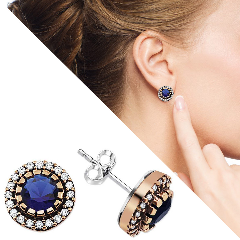 Lacivert Zirkon Taşlı Yuvarlak Tasarım 925 Ayar Gümüş Küpe - 1