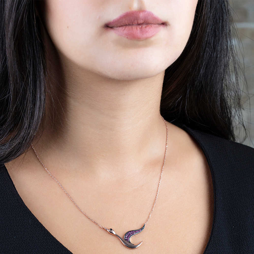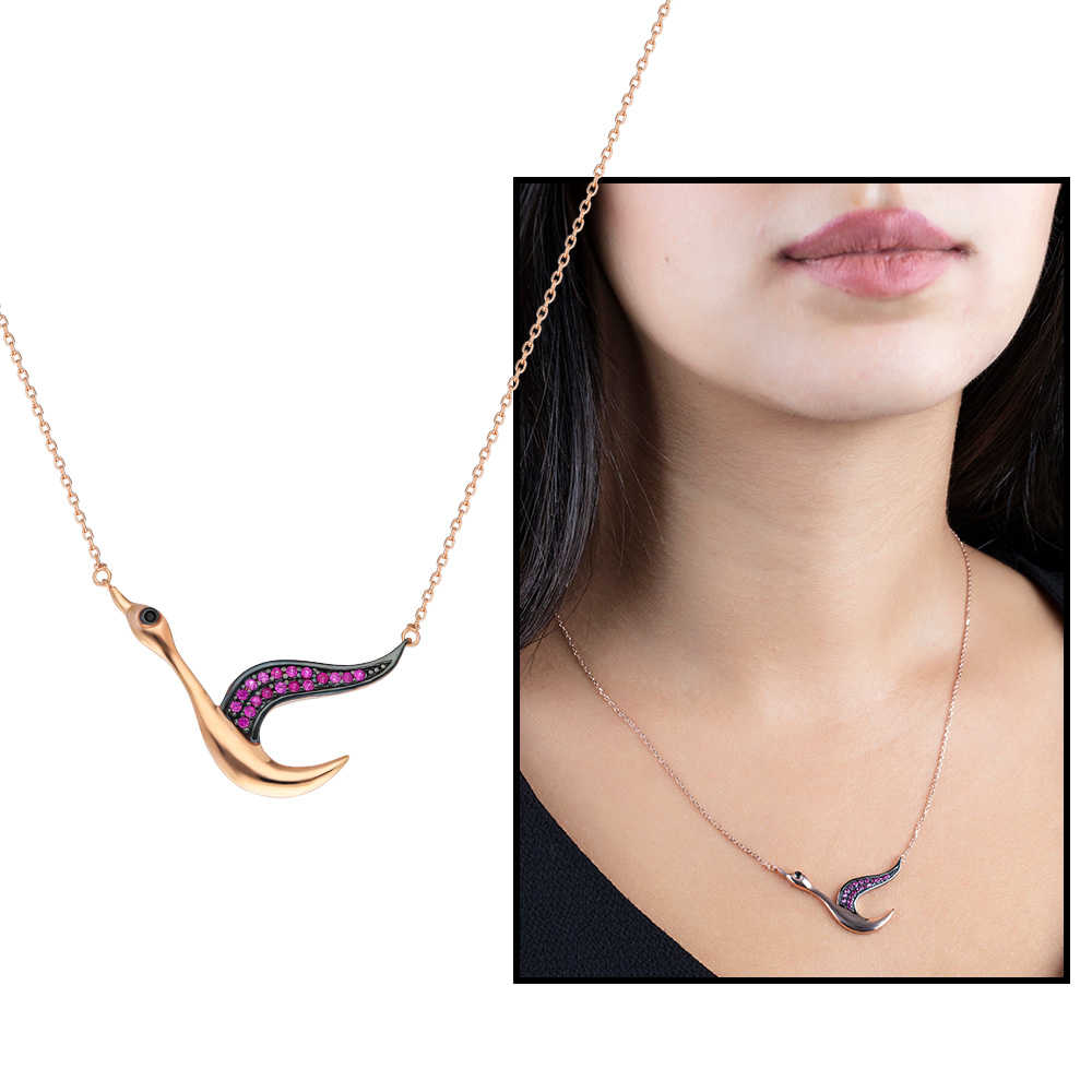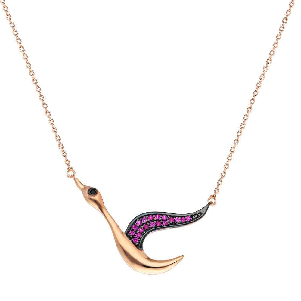 Pembe Zirkon Taşlı Uçan Kaz Tasarım 925 Ayar Gümüş Bayan Kolye