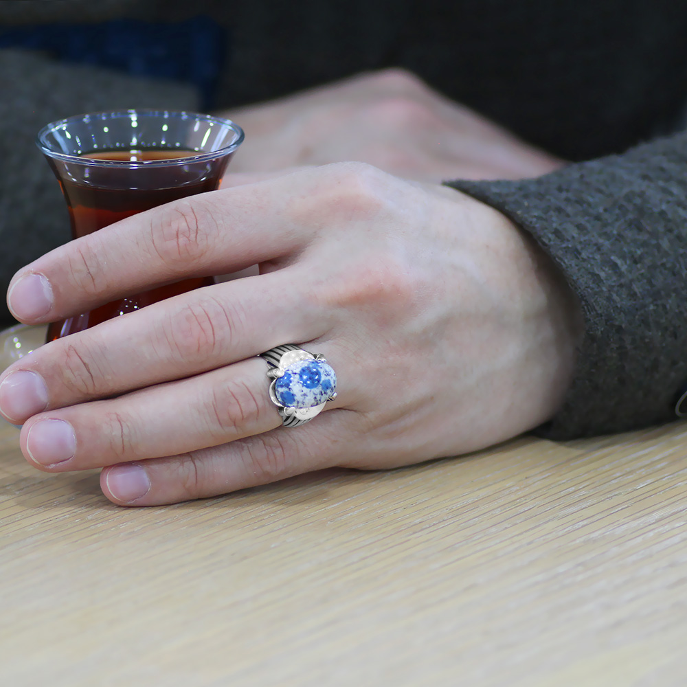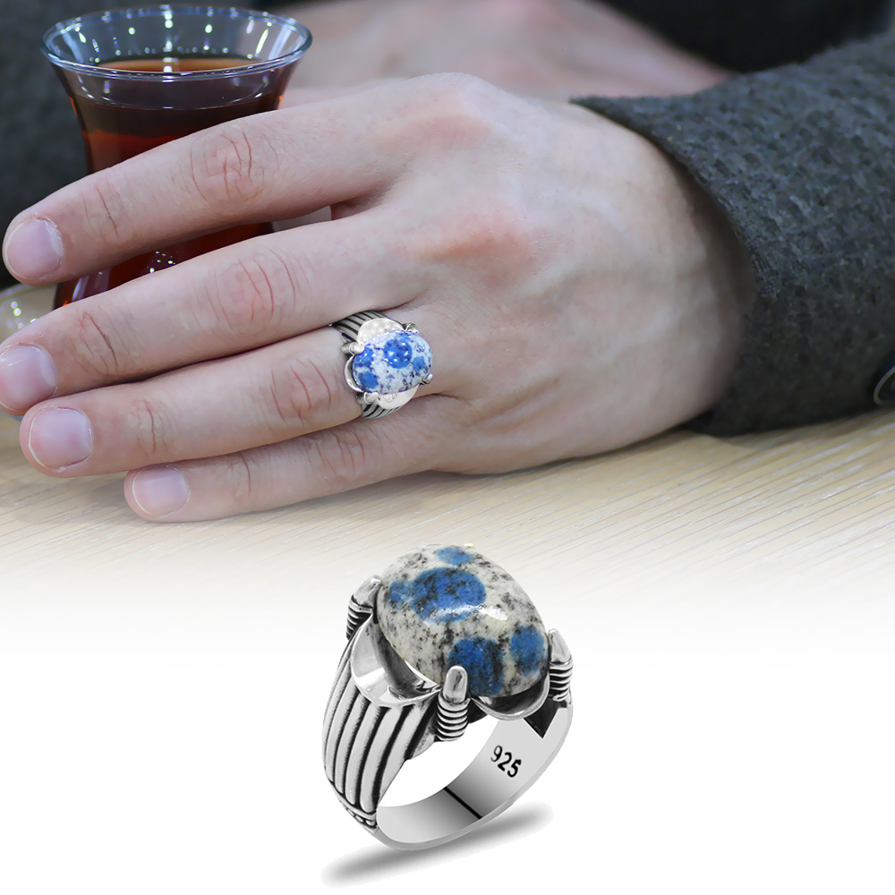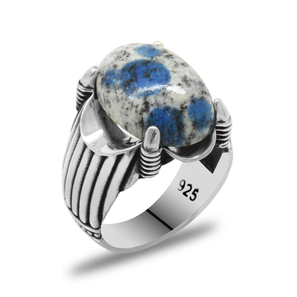Has Mavi Beyaz Mercan Taşlı Pençe Tasarım 925 Ayar Gümüş Erkek Yüzük - 2