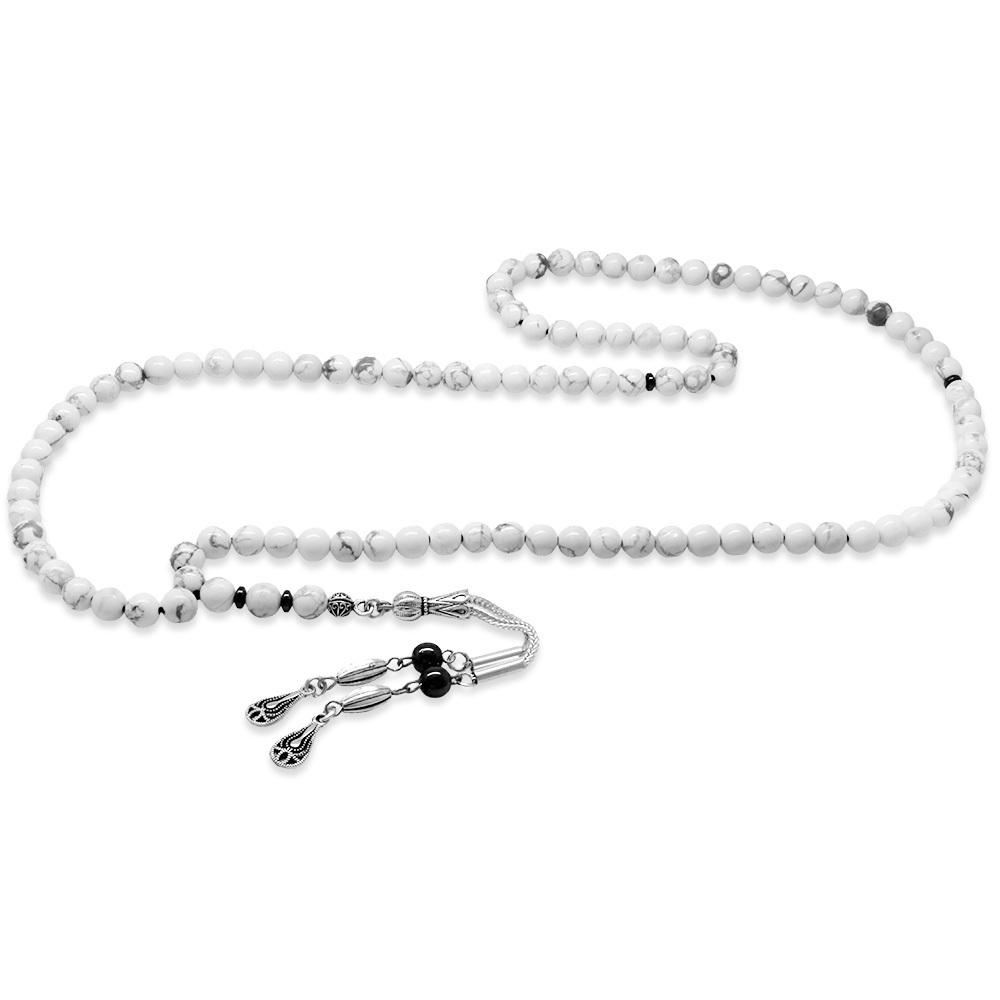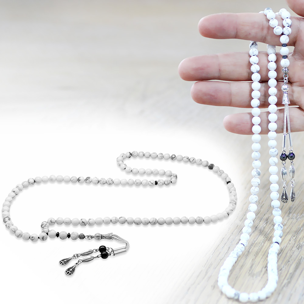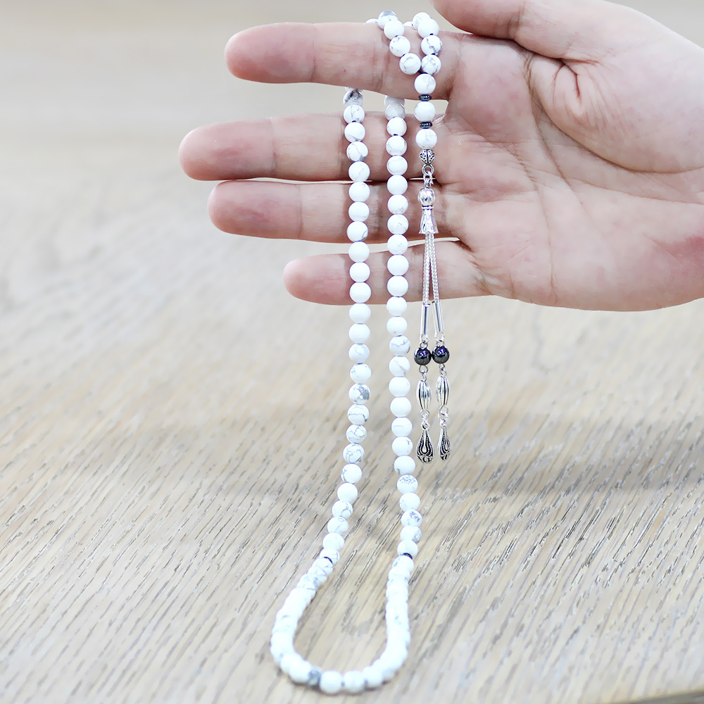 Havlit Doğaltaş Namaz Tesbihi - Kararmaz Metal Damla Püsküllü - Beyaz Renk - Küre Kesim