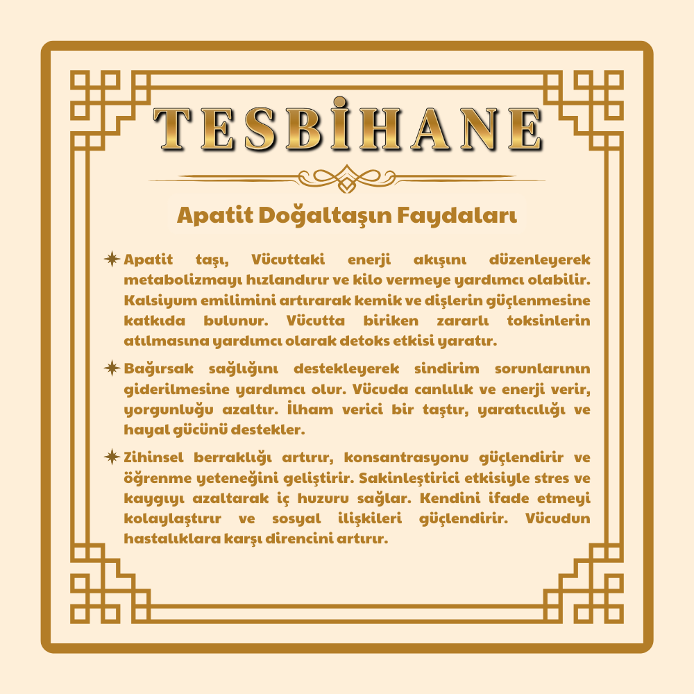 Apatit taşı, canlı renkleriyle dikkat çeken ve dengeleyici özellikleriyle bilinen değerli bir doğal taştır. Genellikle kişisel gelişim, motivasyon ve içsel dengeyi destekleyen bir taş olarak kullanılır. Zihinsel berraklık kazandırdığı, odaklanmayı kolaylaştırdığı ve yaratıcılığı teşvik ettiği düşünülür. Ayrıca, pozitif enerjiyle ilişkilendirilir ve kişinin kendini ifade etmesine yardımcı olur. Apatit taşı, hem estetik görünümü hem de enerjisel özellikleriyle takı ve dekoratif objelerde sıklıkla tercih edilir.