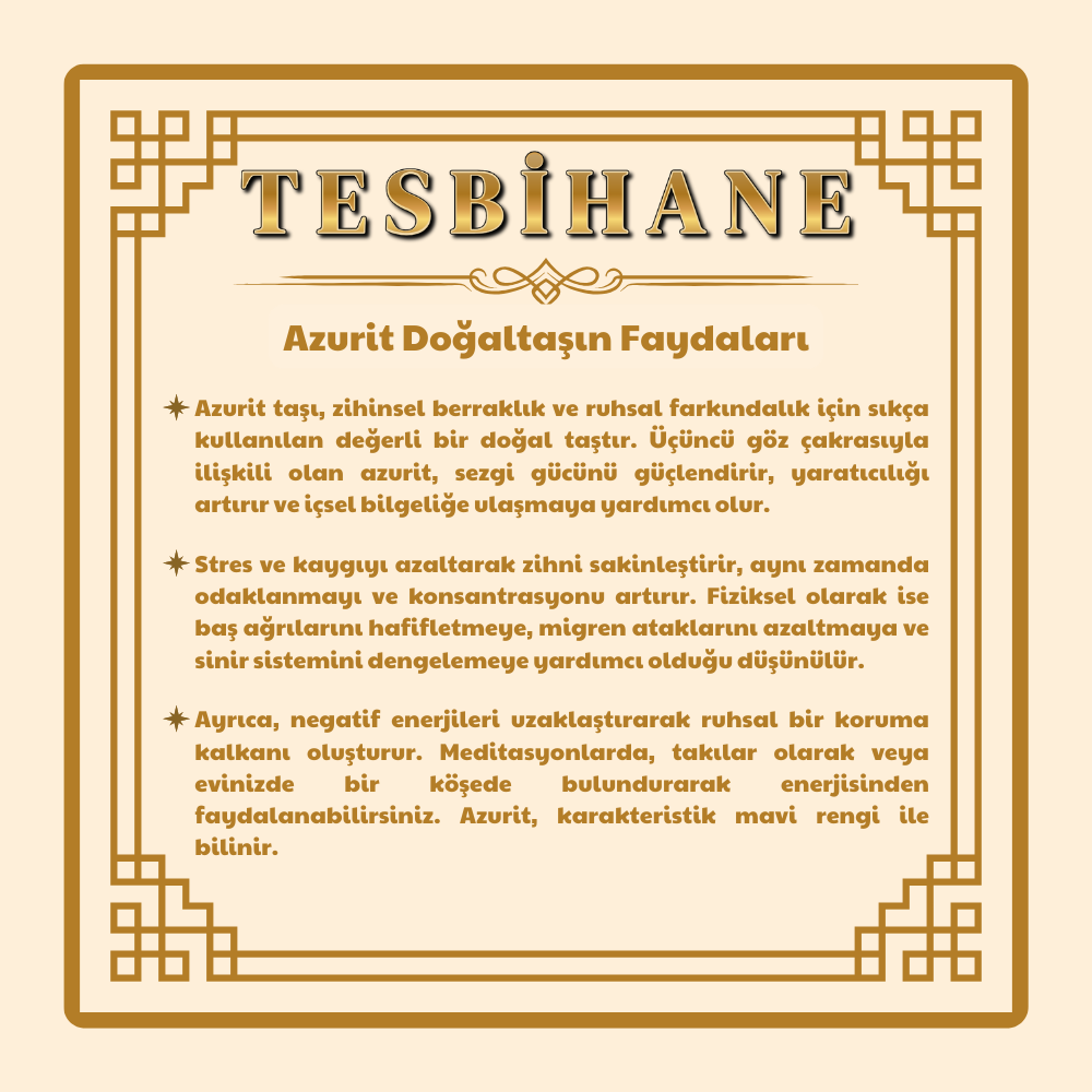 Azurit, derin mavi tonlarıyla dikkat çeken ve zihinsel berraklıkla ilişkilendirilen bir doğal taştır. Sezgi gücünü ve farkındalığı artırdığına inanılır. Zihni sakinleştirerek odaklanmayı kolaylaştırabilir, yaratıcılığı destekleyebilir ve içsel dengeyi güçlendirebilir. Stres ve zihinsel yorgunluğu azaltmaya yardımcı olur. Enerji açısından arındırıcı özellikleriyle bilinen azurit taşı, negatif etkilerden uzaklaşmaya ve ruhsal dengeyi korumaya destek olabilir. Zarif görünümü sayesinde takı ve dekoratif objelerde de sıkça tercih edilir.