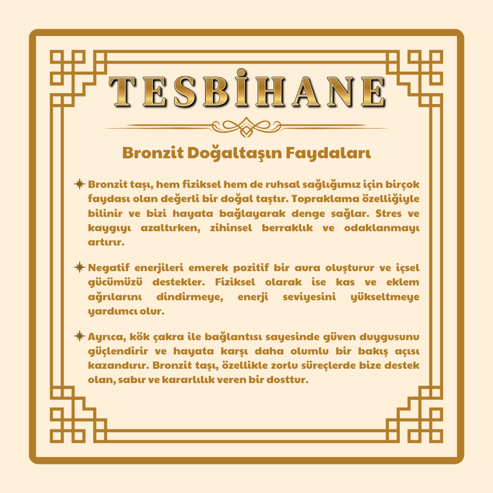 Bronzit taşı, denge ve kararlılığı simgeleyen güçlü bir doğal taştır. Topraklama özelliği sayesinde kişiye sakinlik ve iç huzur kazandırır. Günlük yaşamın stres ve gerginliklerinden arınmayı kolaylaştırarak zihinsel berraklık sağlar. Negatif enerjileri uzaklaştırıp pozitif bir alan oluşturmaya yardımcı olur. Odaklanma ve karar verme süreçlerinde dengeyi destekler. Fiziksel olarak kas ve eklem rahatlığına katkıda bulunduğu düşünülür. Kök çakrayla olan bağlantısı, güven duygusunu güçlendirir ve kişinin hayata daha sağlam adımlarla ilerlemesine yardımcı olur. Bronzit taşı, sabır, dayanıklılık ve istikrar enerjisiyle zorlu dönemlerde güçlü bir destek sağlar.
