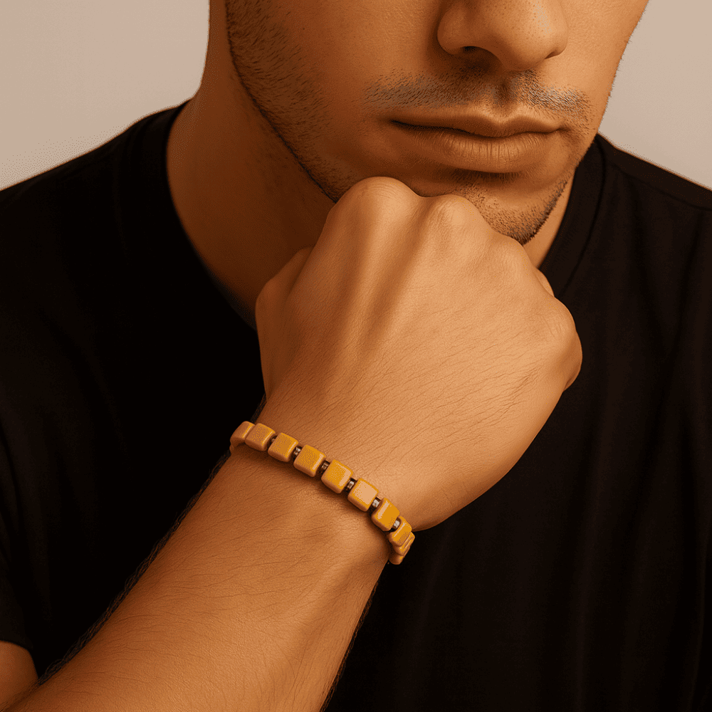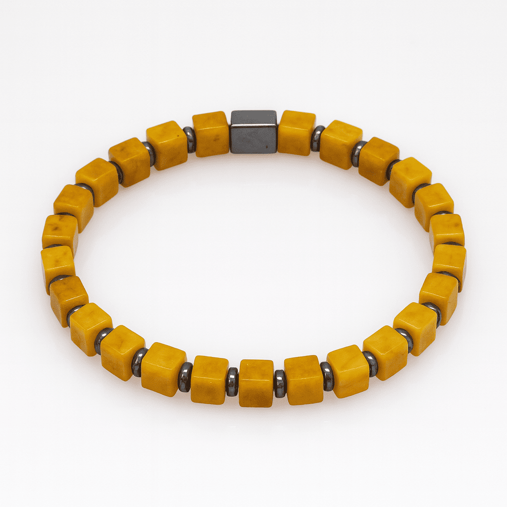 Hematit Doğaltaş Kombinli Küp Kesim Hardal Rengi Doğal Damla Kehribar Erkek Bileklik