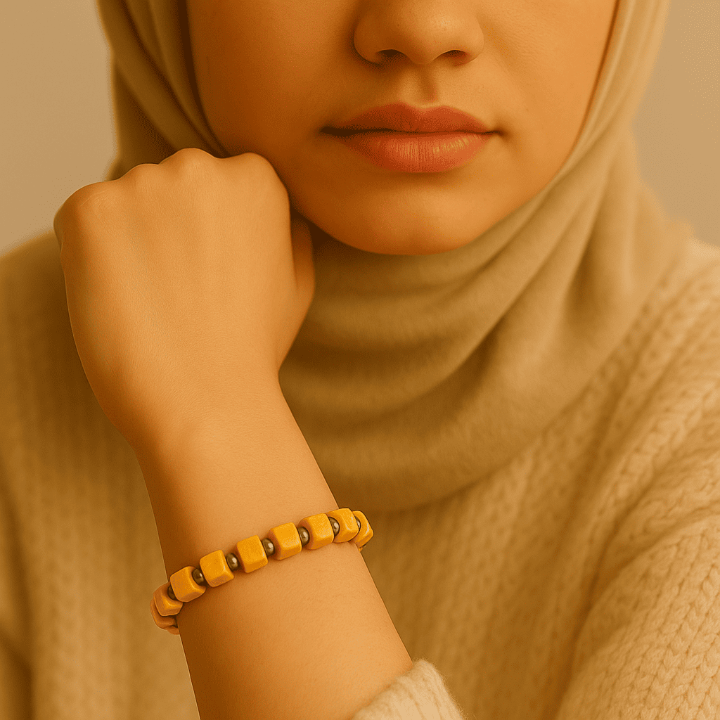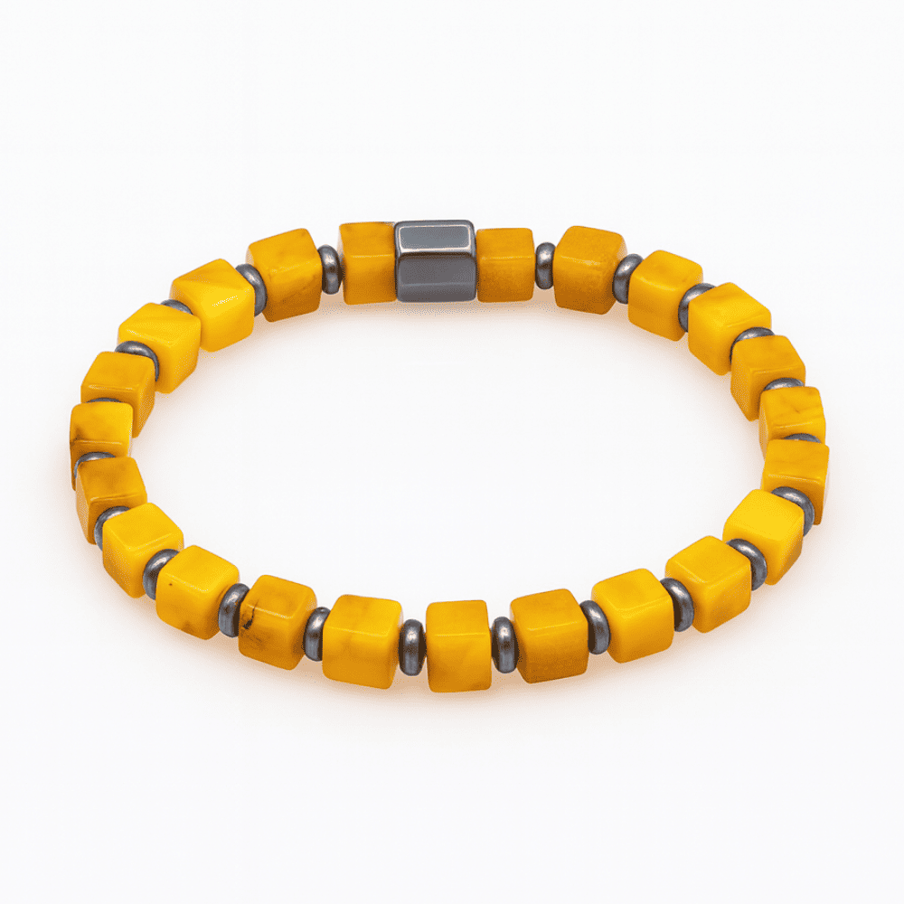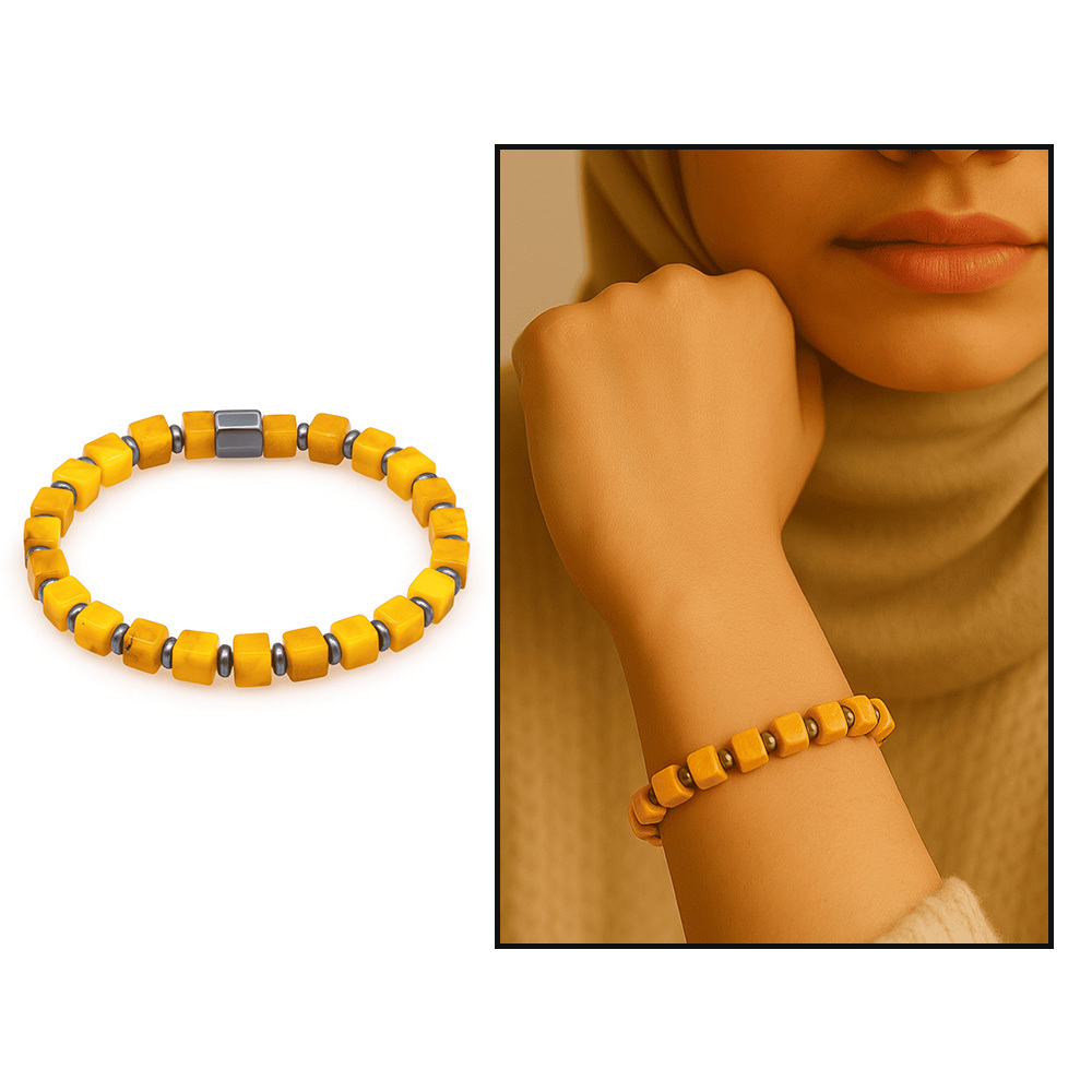 Hematit Doğaltaş Kombinli Küp Kesim Hardal Rengi Doğal Damla Kehribar Kadın Bileklik