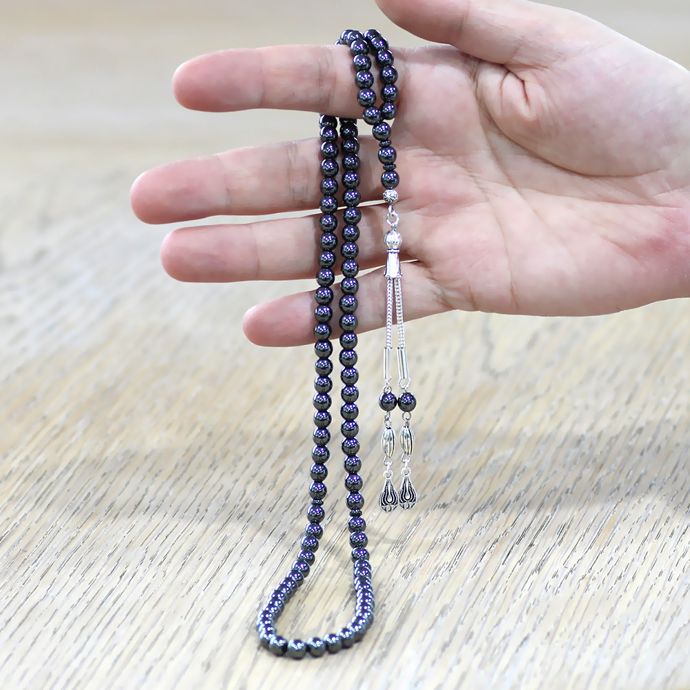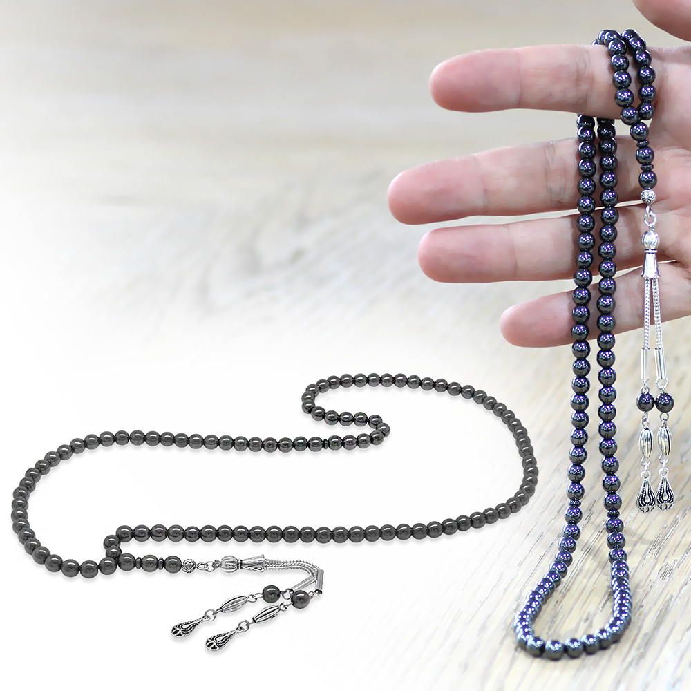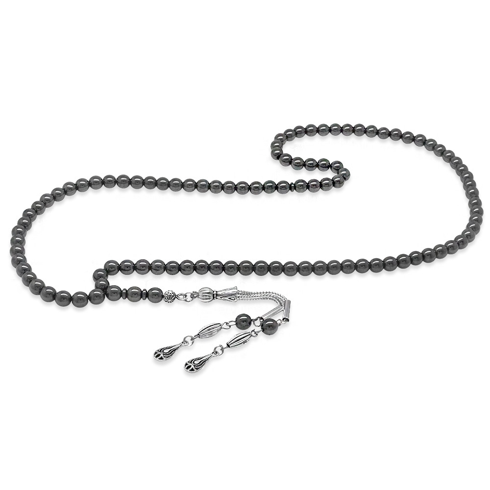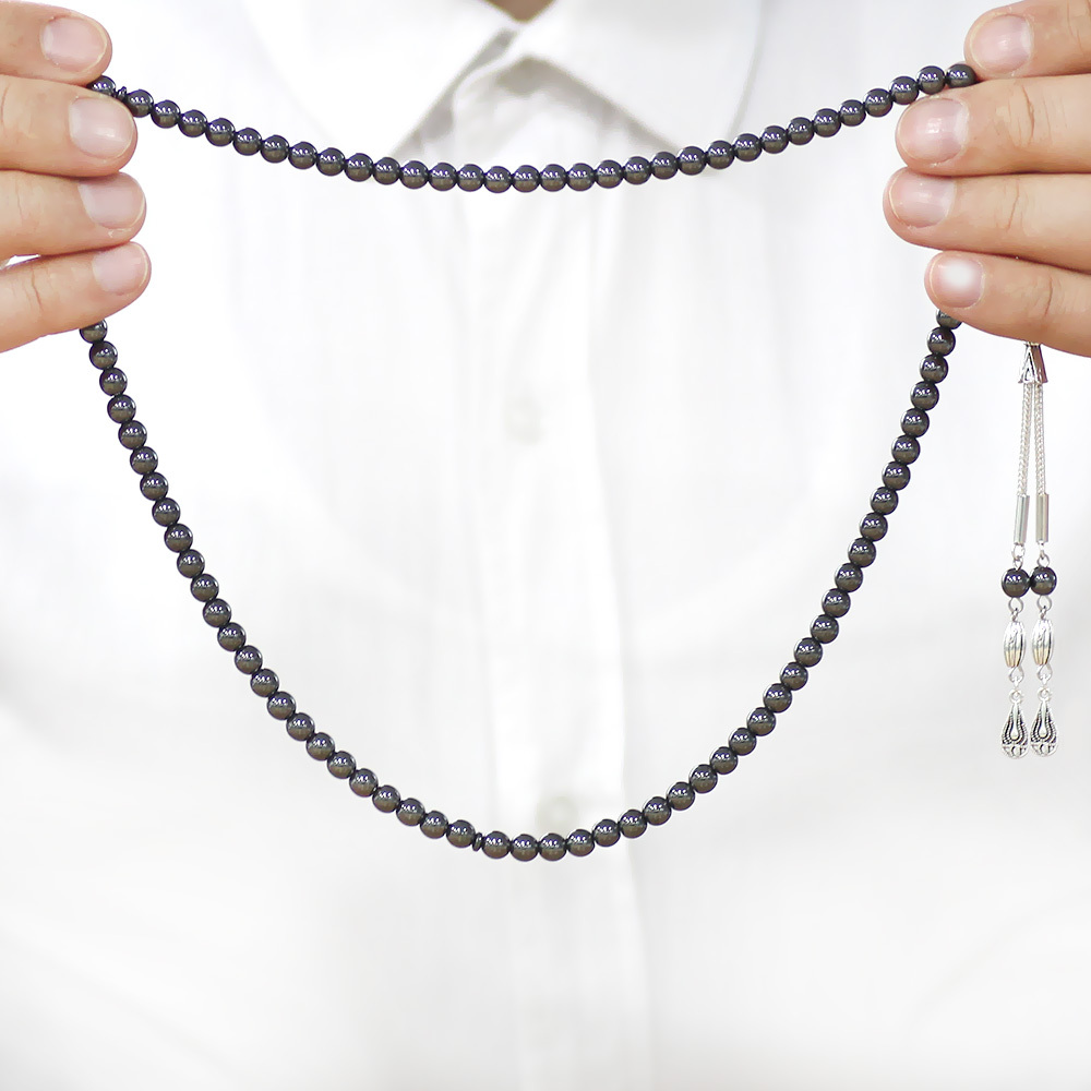 Hematit Doğaltaş Namaz Tesbihi - Kararmaz Metal Damla Püsküllü - Gri Renk - Küre Kesim