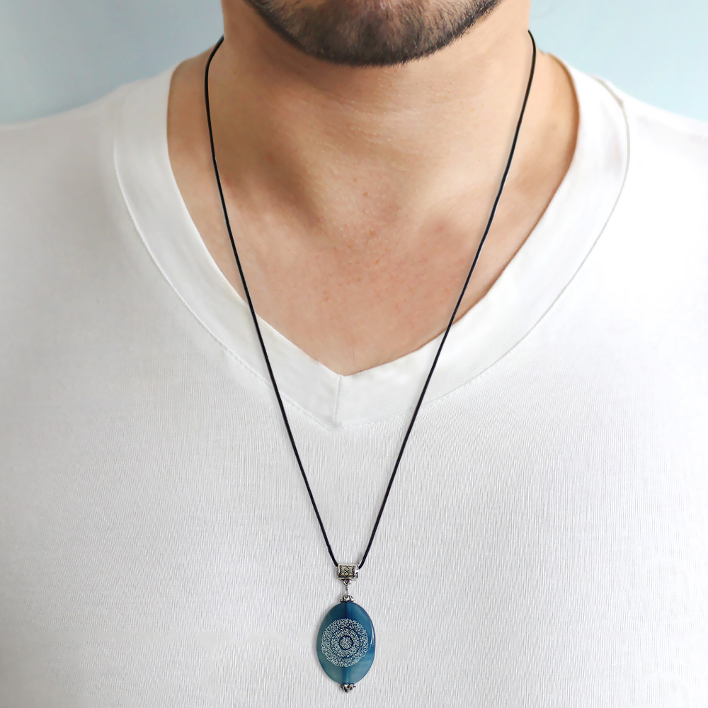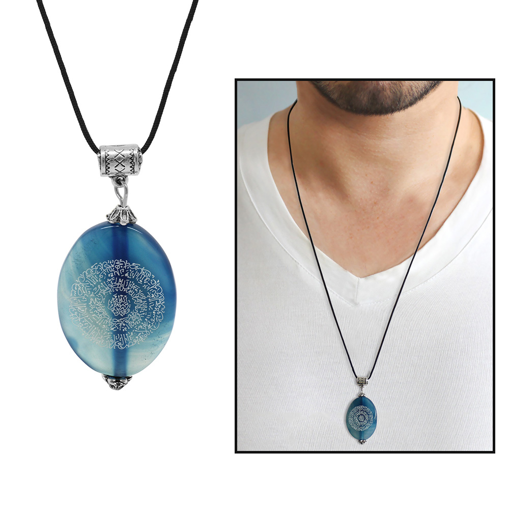 Hilyei Şerif Yazılı Mavi Yemen Akik Taşı Erkek Kolye - Yemen Zırhı