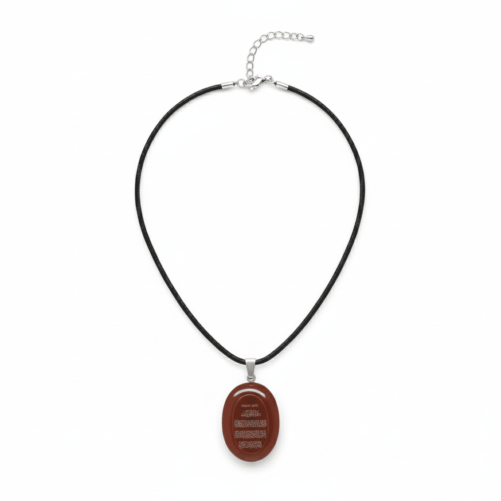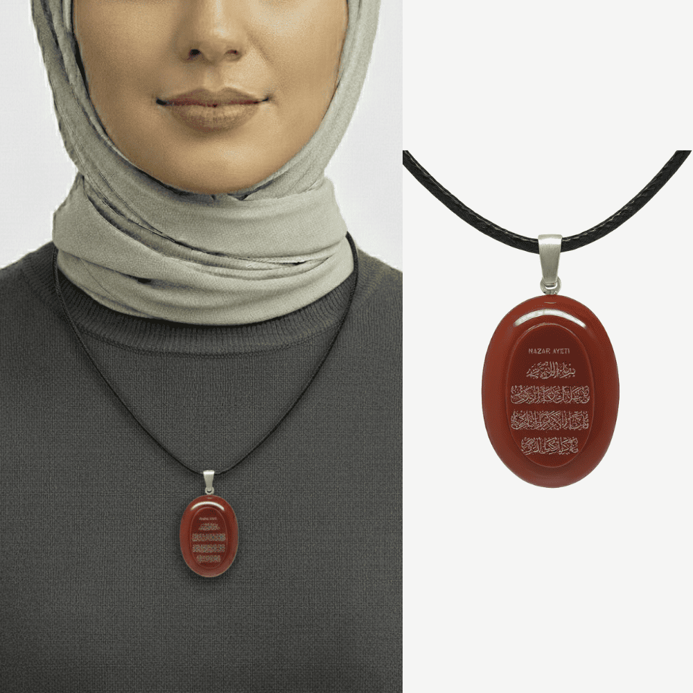 Kadın Akik Doğaltaş Cevşen Kolye - Üzeri Nazar Ayeti Yazılı - Elips Tasarım - Kırmızı Renk
