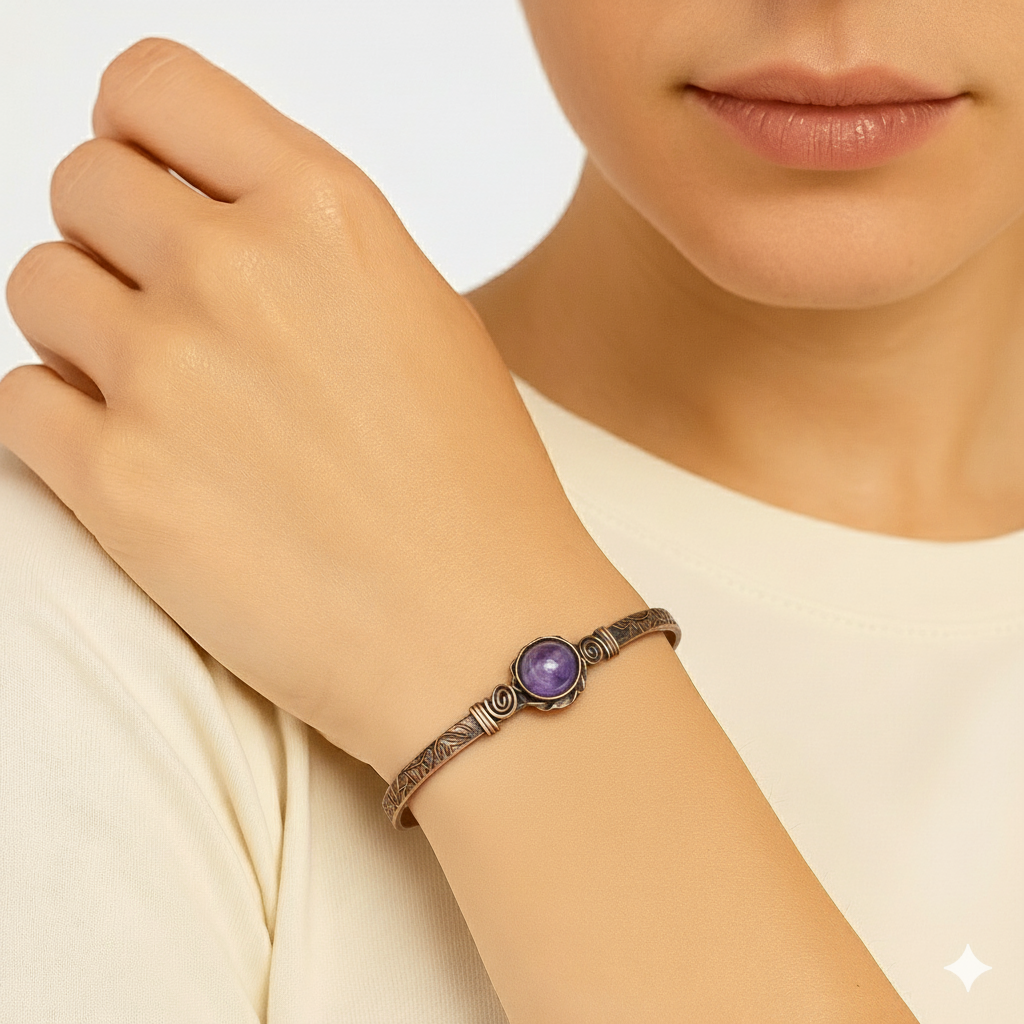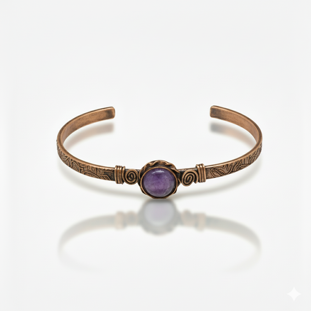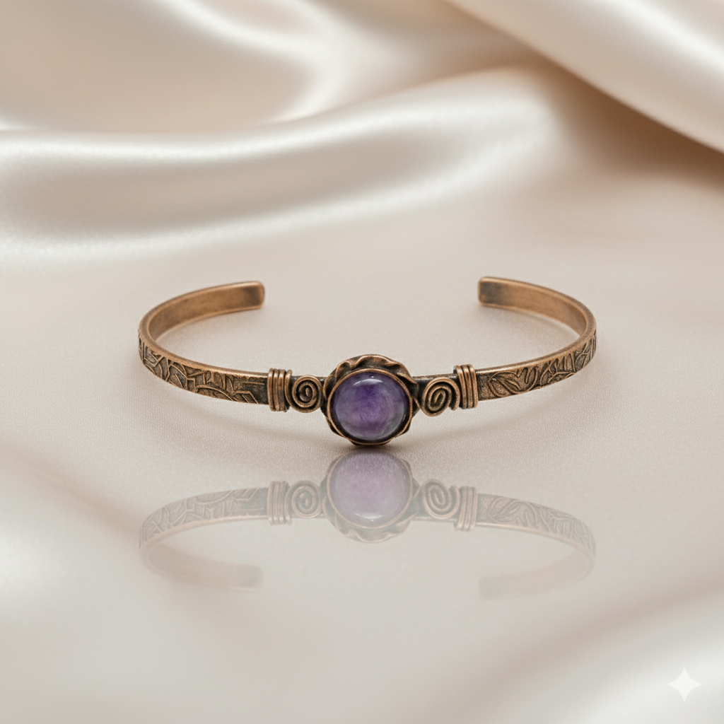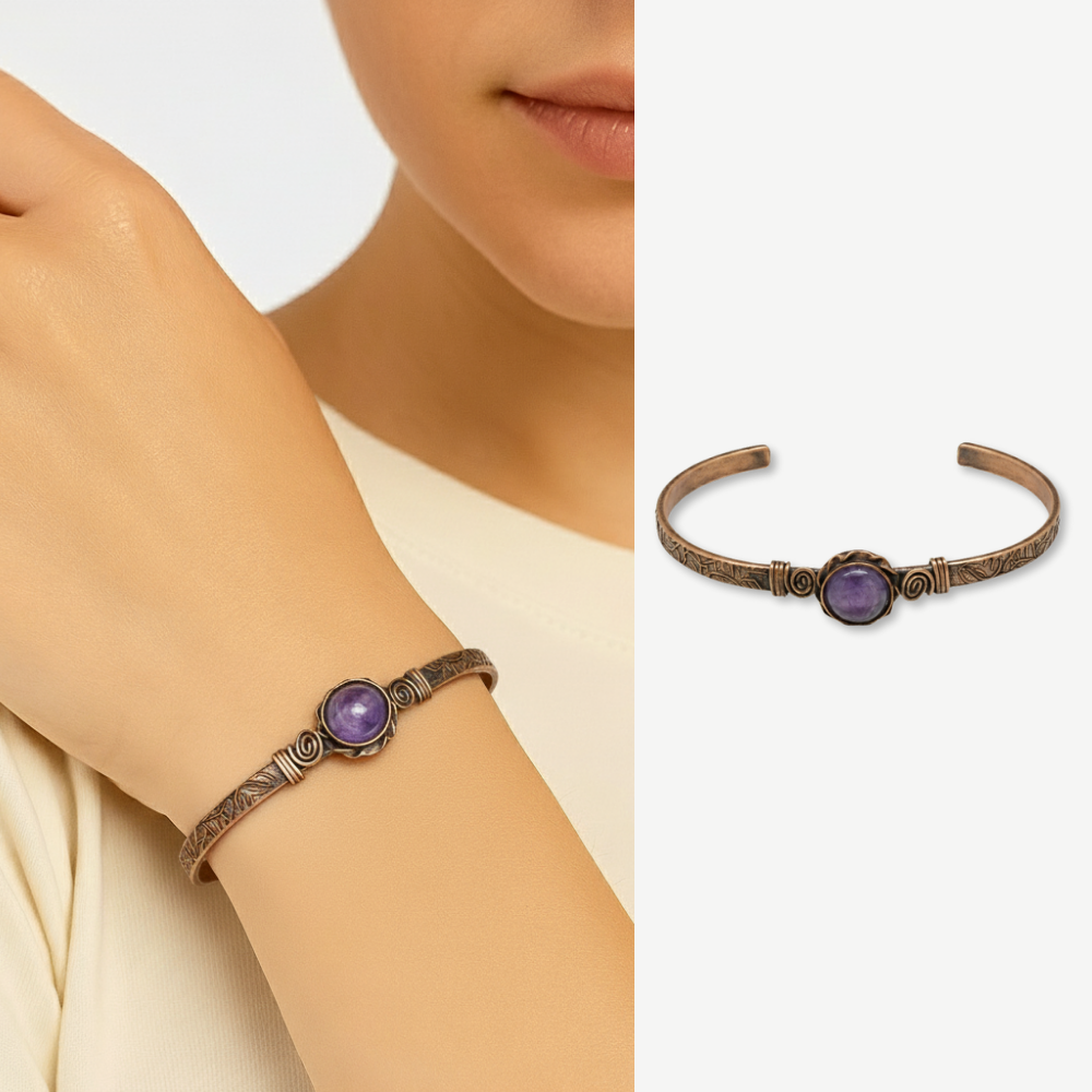 Kadın Bakır Bileklik - Ametist Doğaltaşlı - Otantik Tasarım - Ayarlanabilir Yapı