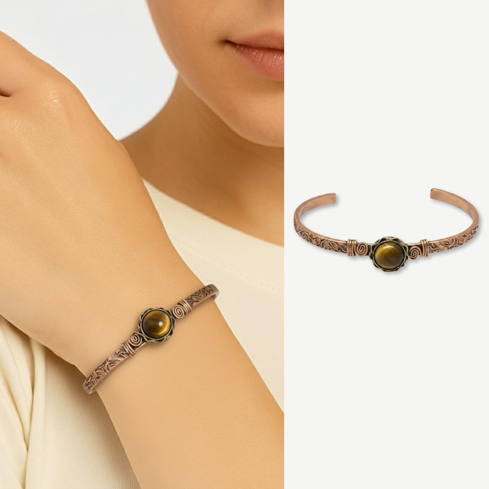 Kadın Bakır Bileklik - Kaplan Gözü Doğaltaşlı - Otantik Tasarım - Ayarlanabilir Yapı