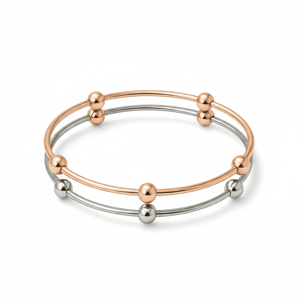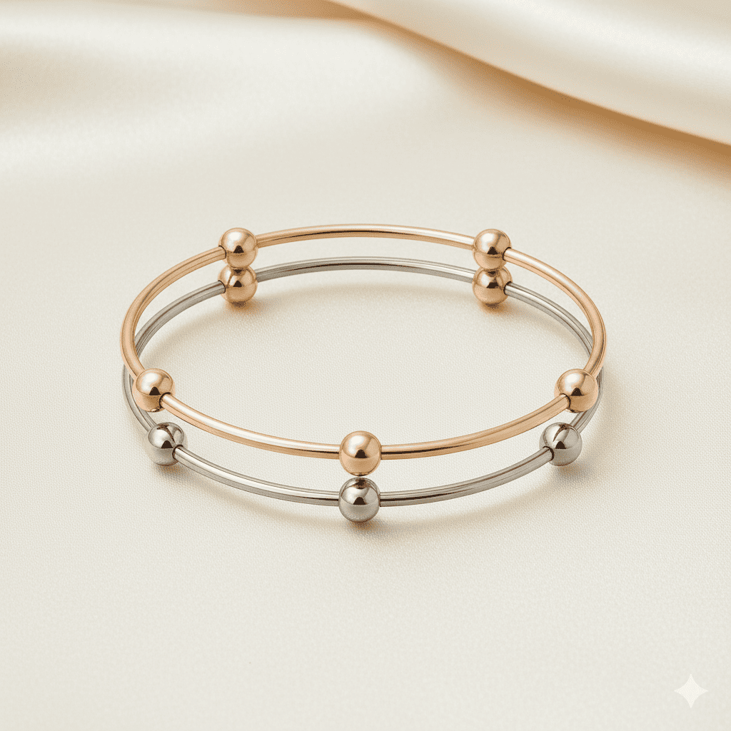 Kadın Çelik Bileklik - Beş Top Süslemeli Tasarım - İkili Model - Gümüş Rose Renk