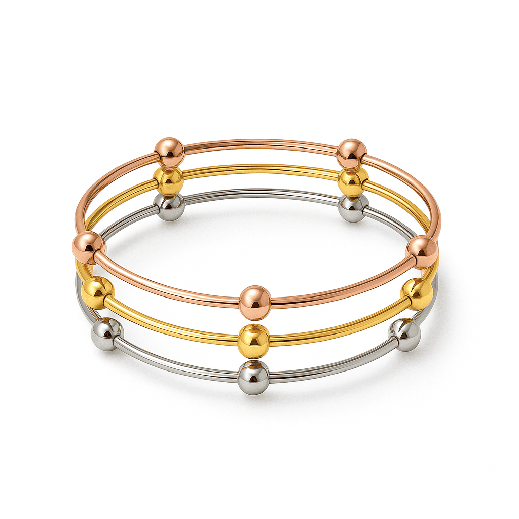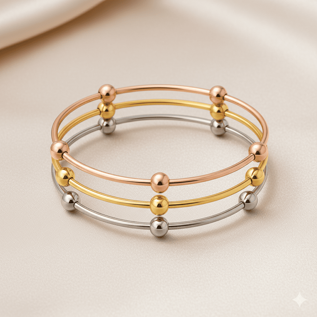 Kadın Çelik Bileklik - Beş Top Süslemeli Tasarım - 3 lü Model - Gümüş Altın Rose Renk