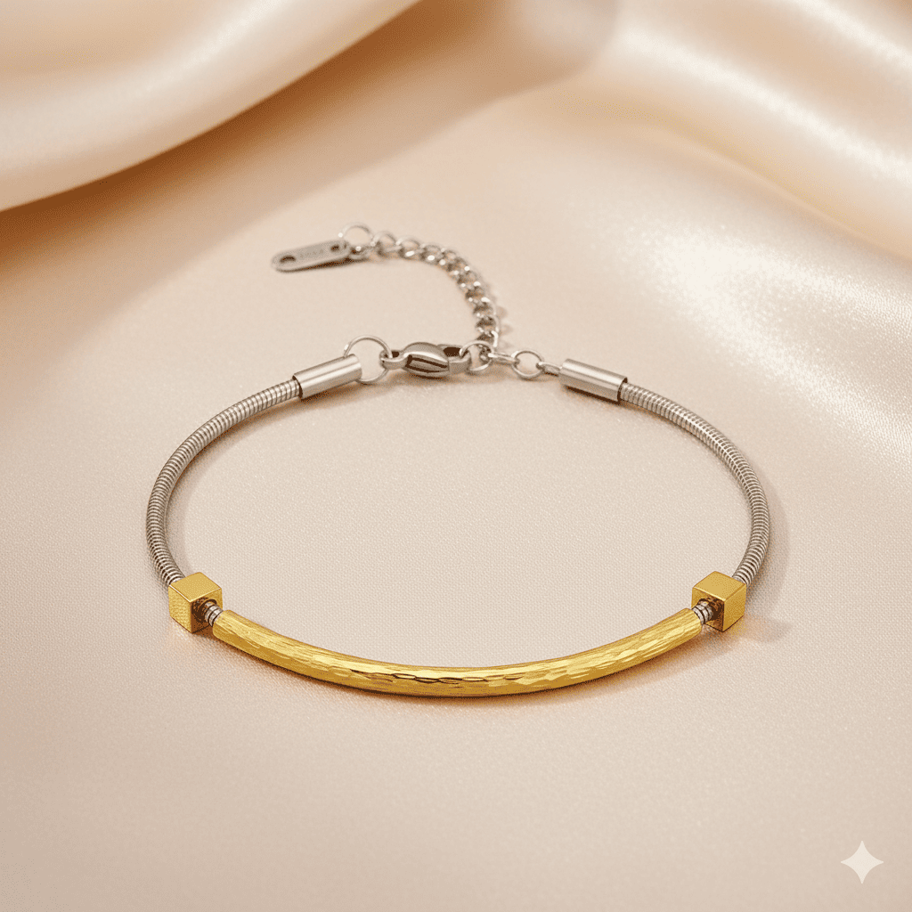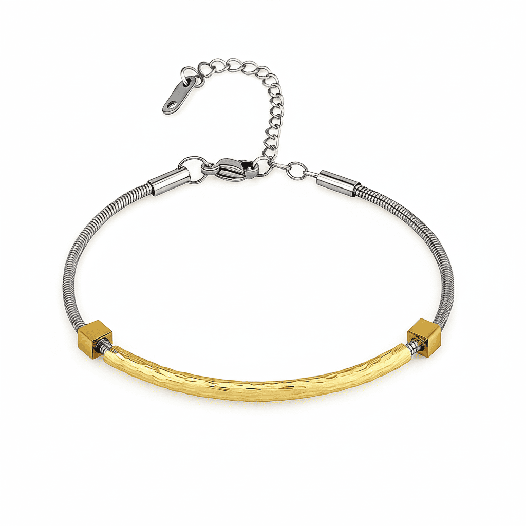 Kadın Çelik Bileklik - Gümüş Renk Snake Model - Altın Renk Taşlama Plakalı