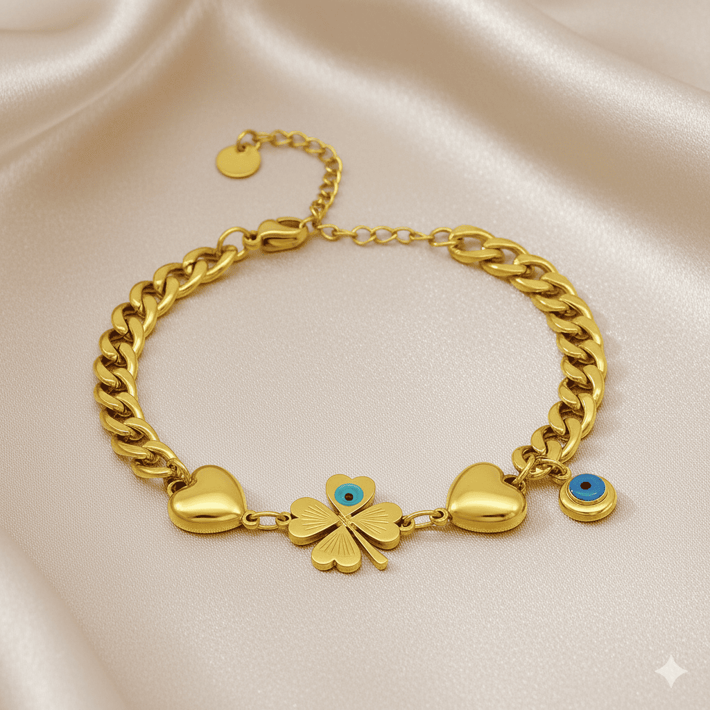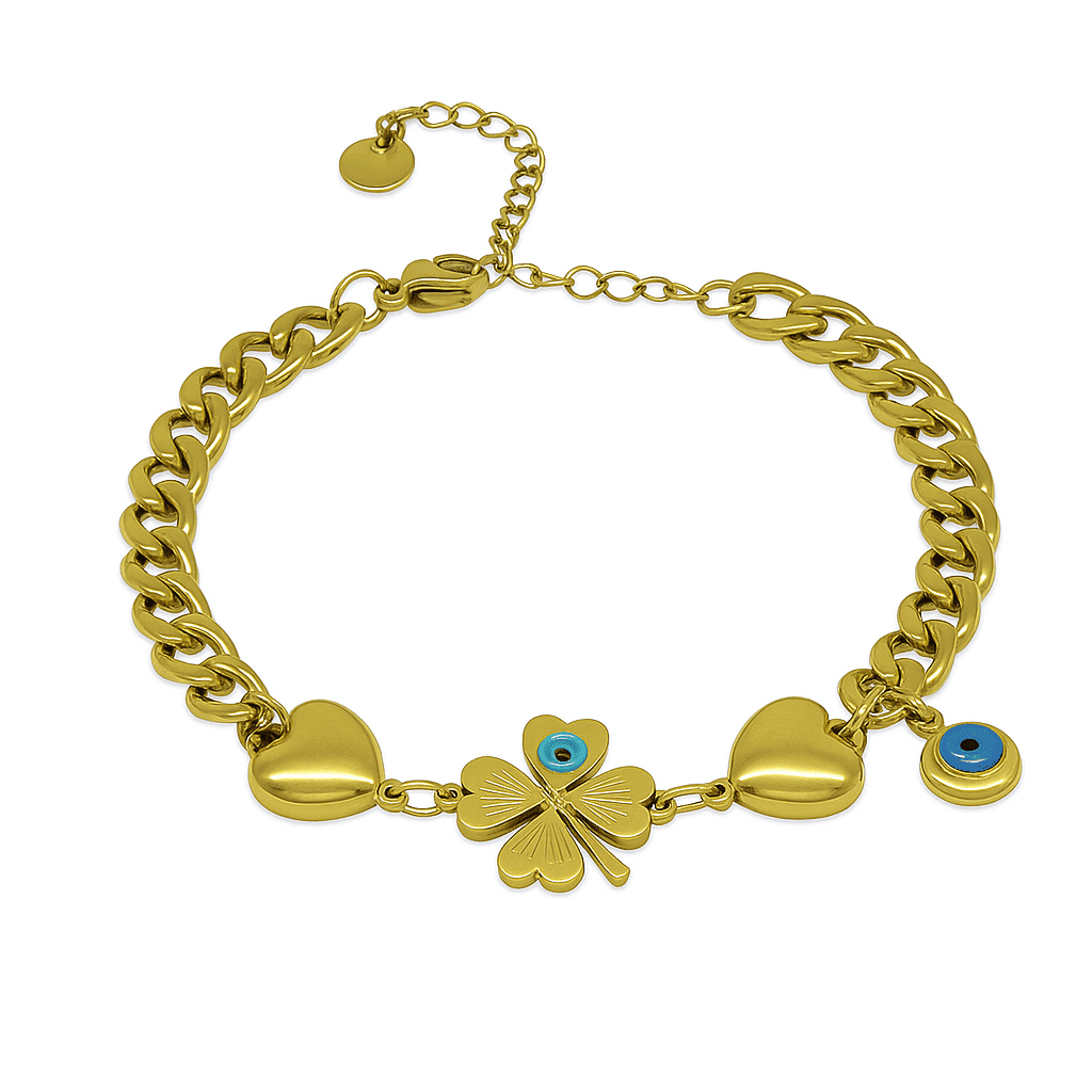 Kadın Çelik Bileklik - Gurmet Model - Yonca Yaprağı Detaylı - Kalp Süslemeli - Altın Renk