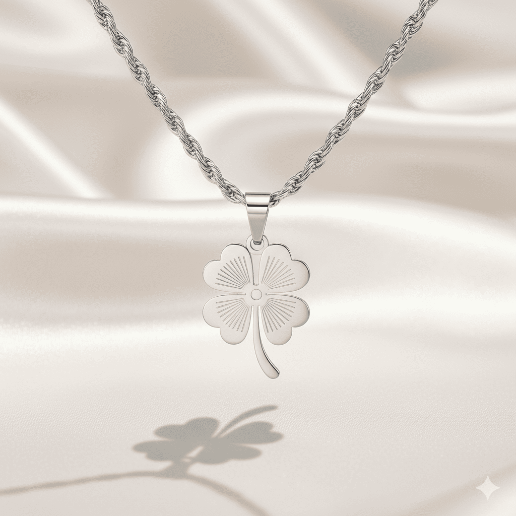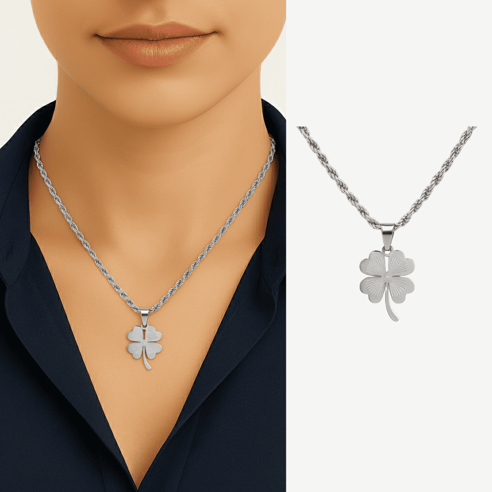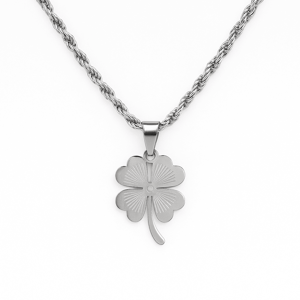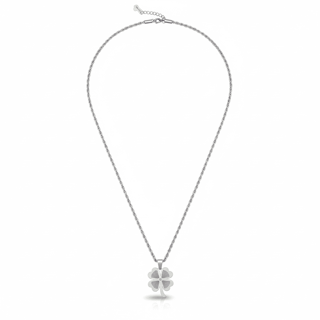 Kadın Çelik Kolye - Burma Model Zincirli - Yonca Yaprağı Tasarım - Gümüş Renk
