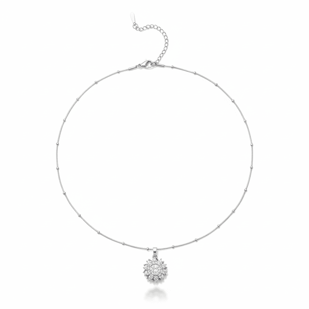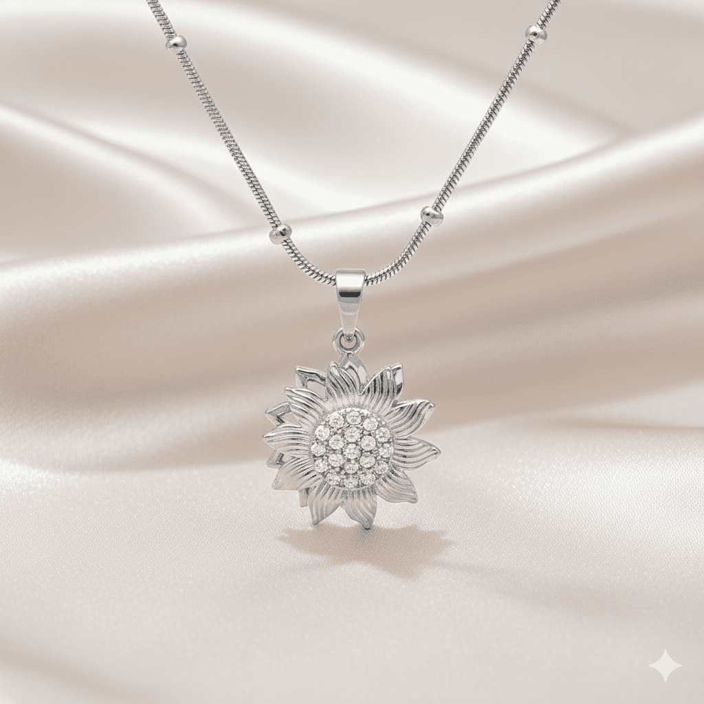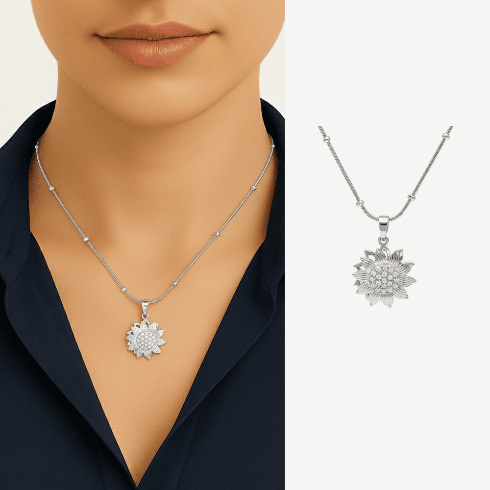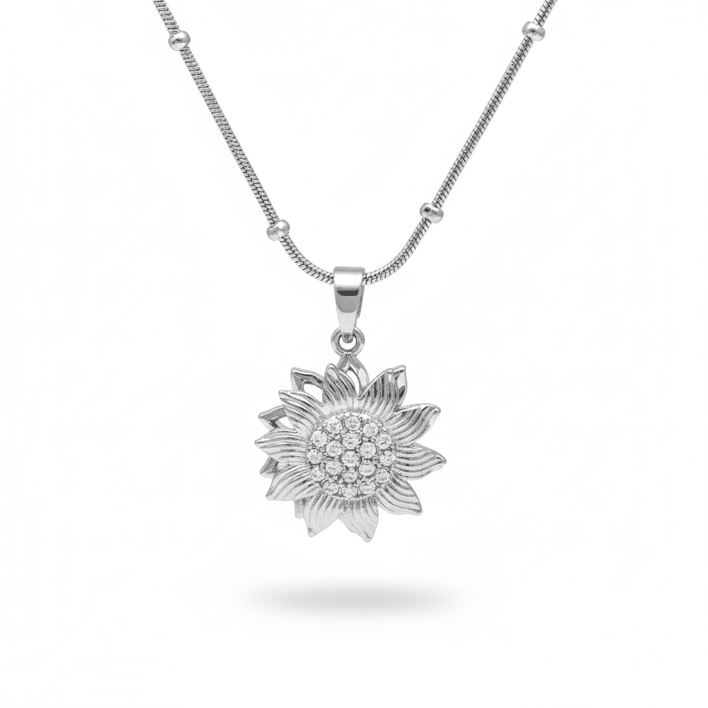 Kadın Çelik Kolye - Güne Bakan Tasarım - Beyaz Zirkon Taşlı - Stres Çarkı Model - Gümüş Renk