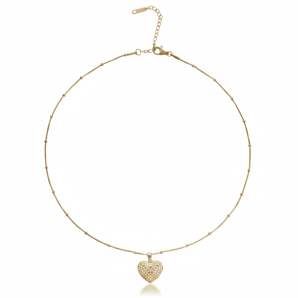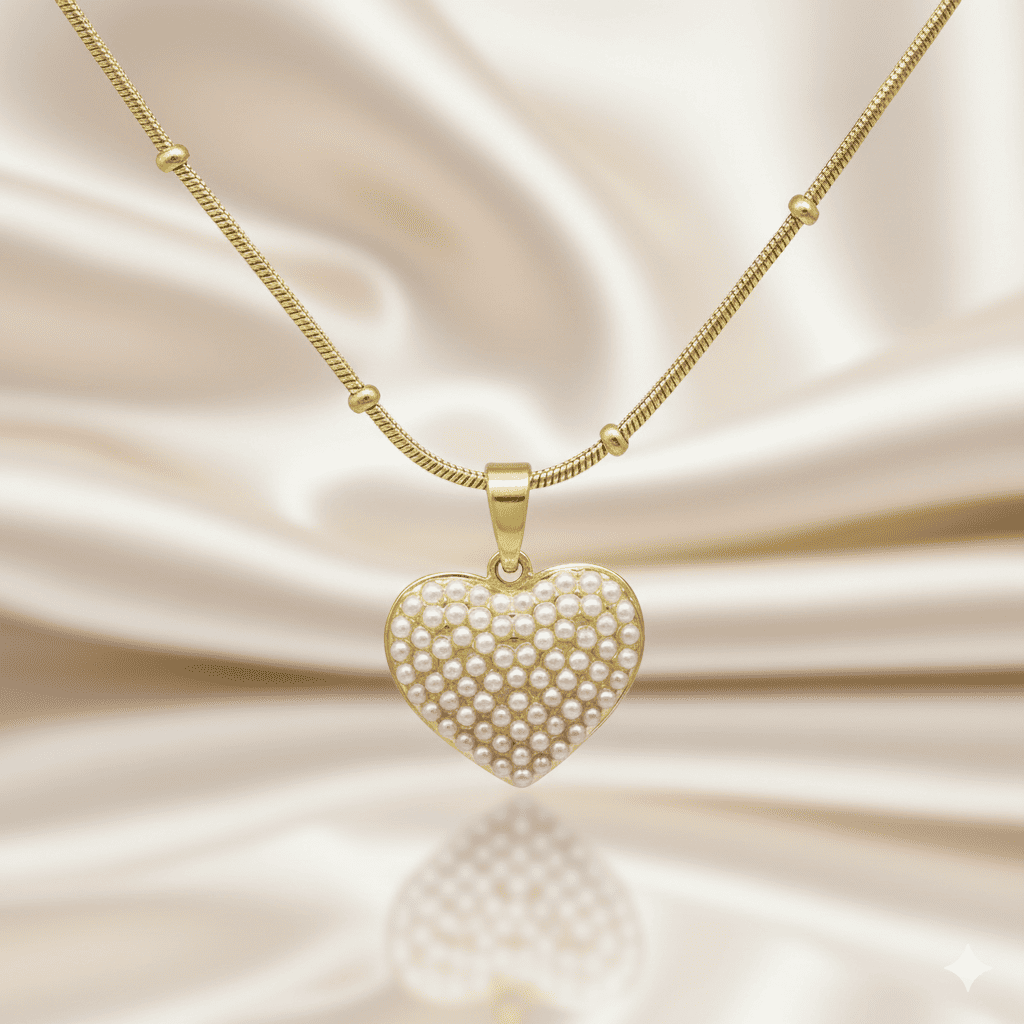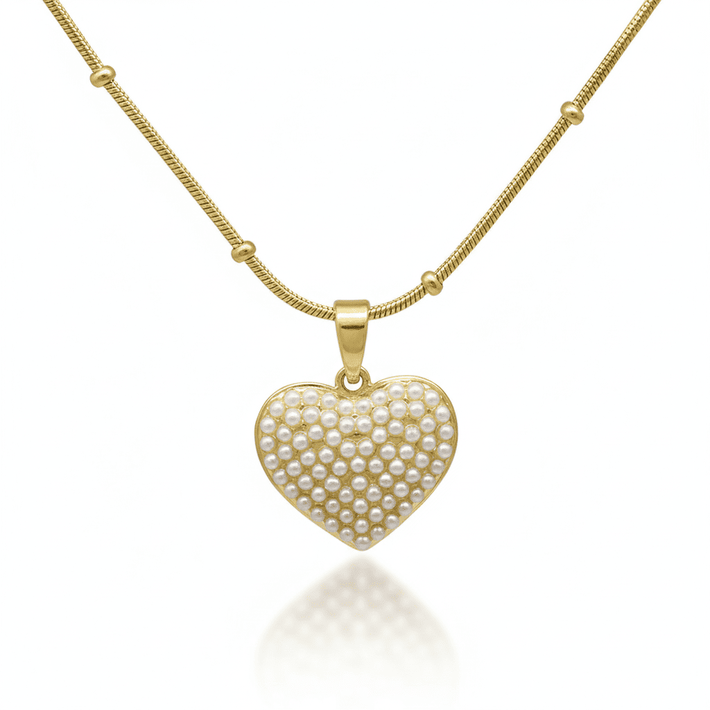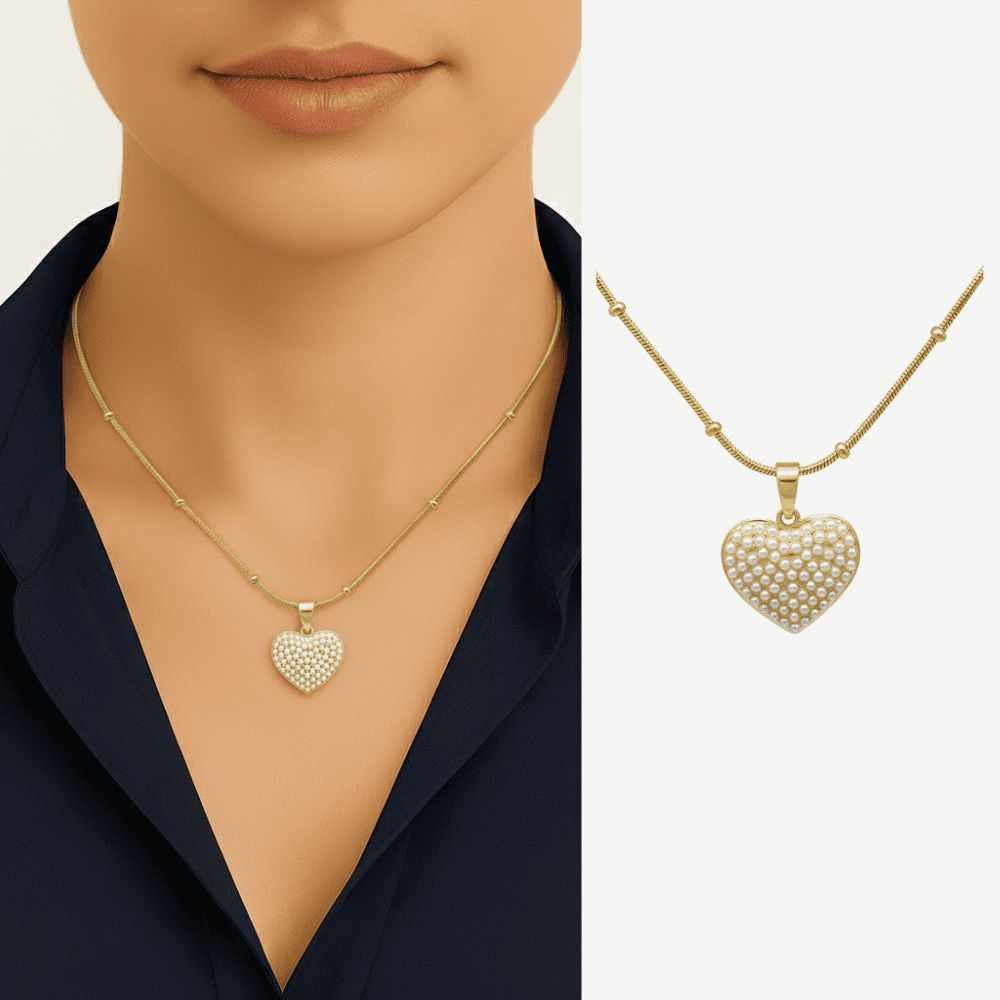 Kadın Çelik Kolye - Kalp Tasarım - Toplu Snake Zincirli - İnci Taşlı - Altın Renk