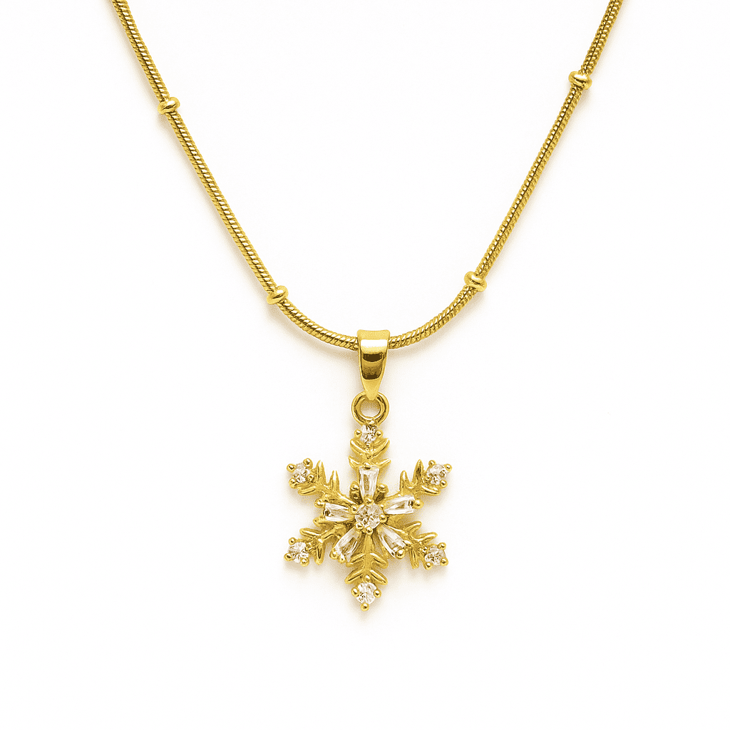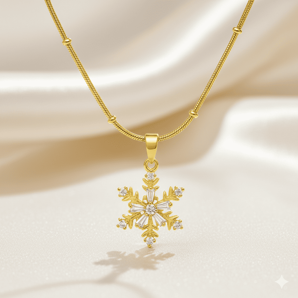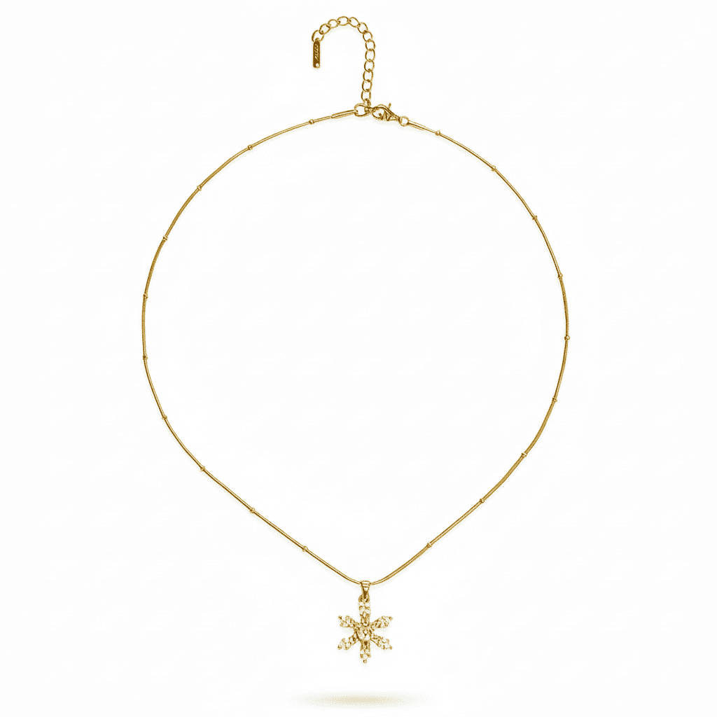 Kadın Çelik Kolye - Kar Tanesi Tasarım - Beyaz Zirkon Taşlı - Stres Çarkı Model - Altın Renk