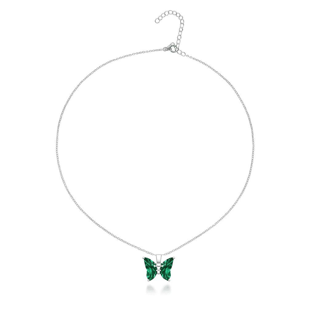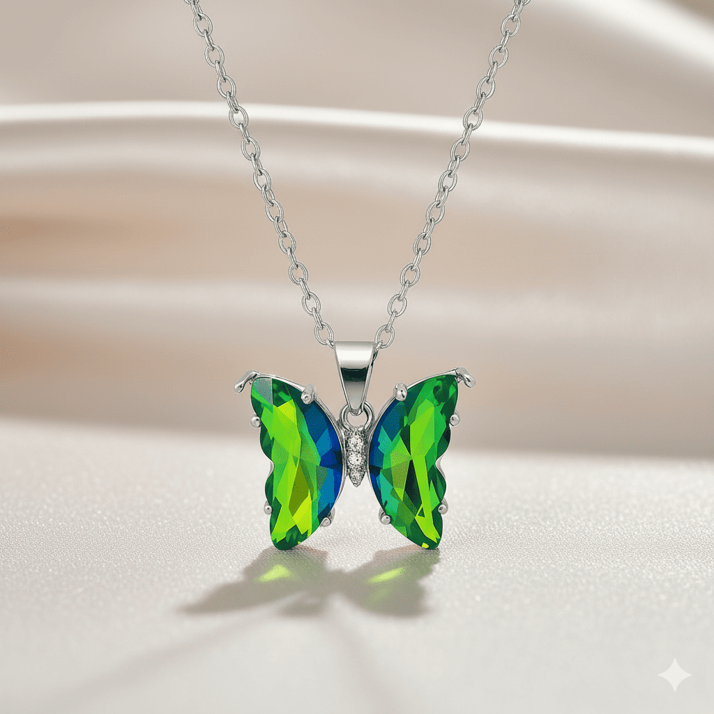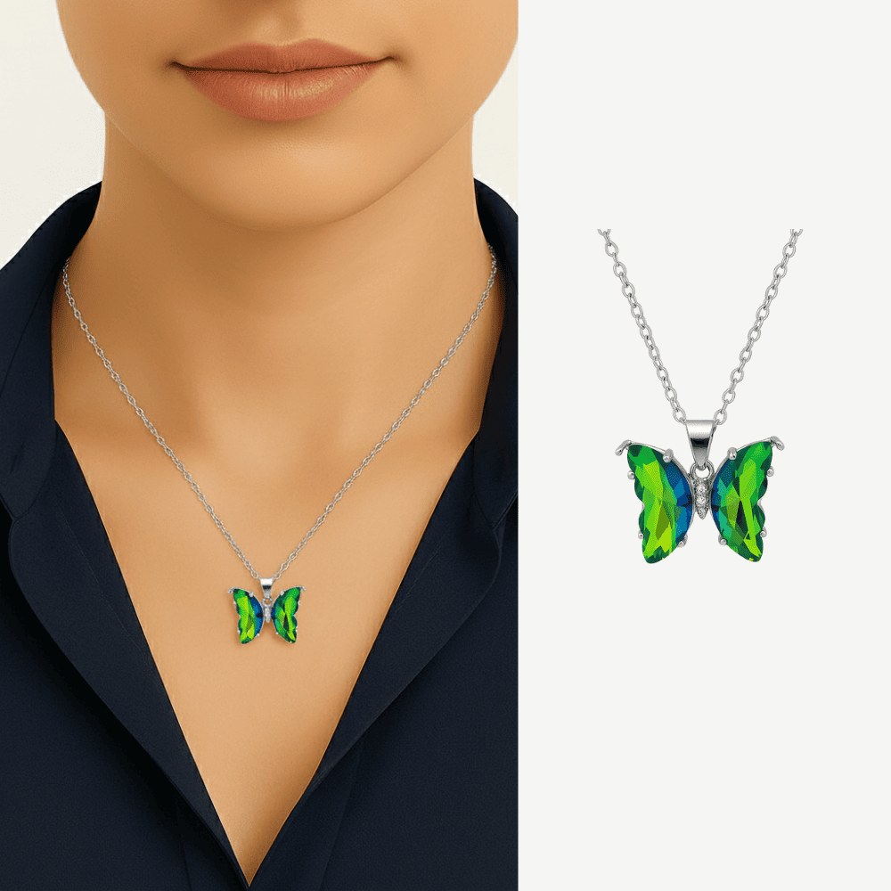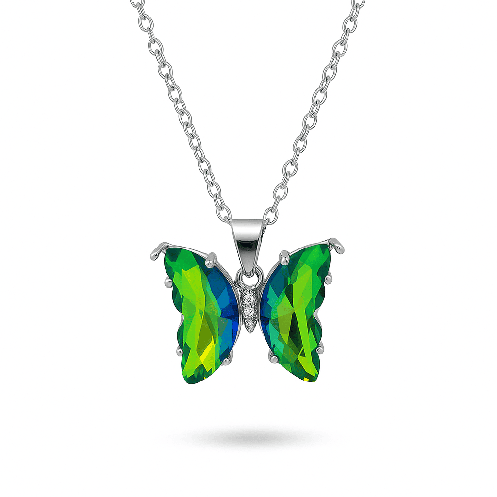 Kadın Çelik Kolye - Kelebek Tasarım - Yeşil Turkuaz Zirkon Taşlı - Gümüş Renk