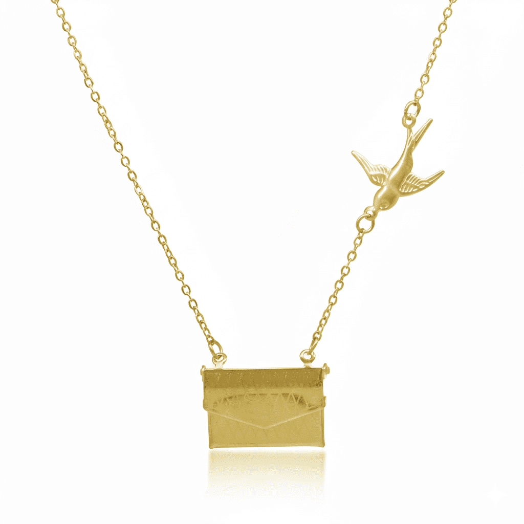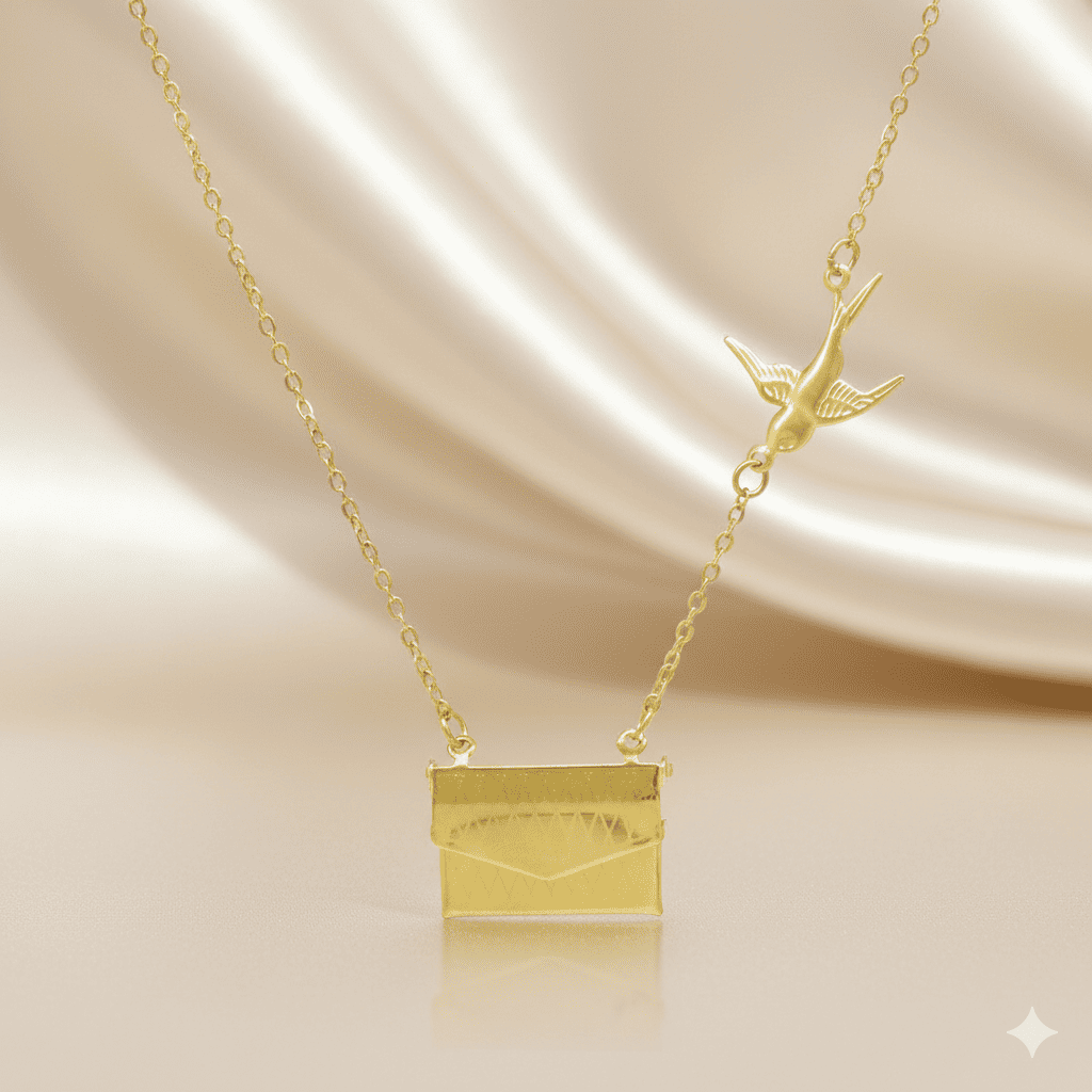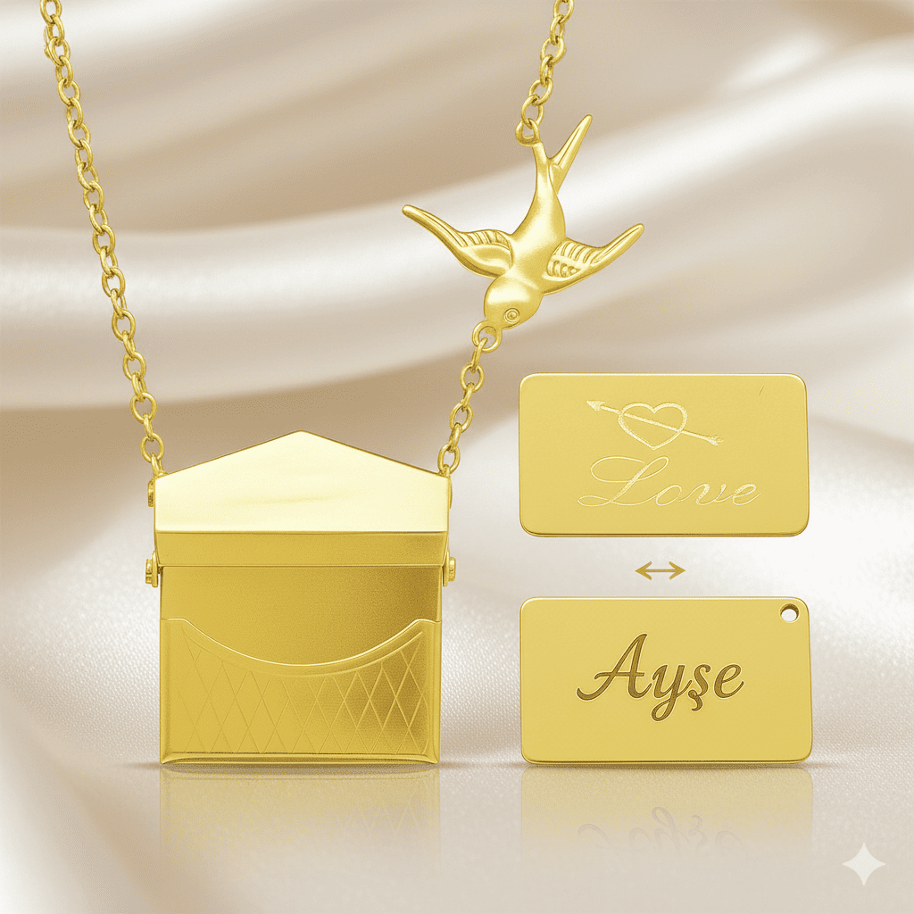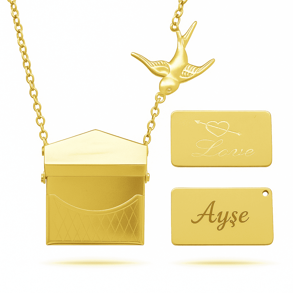 Kadın Çelik Kolye - Posta Güvercini Detaylı - Forse Zincirli - İsme Özel Yazılı - Altın Renk