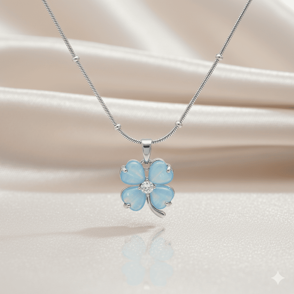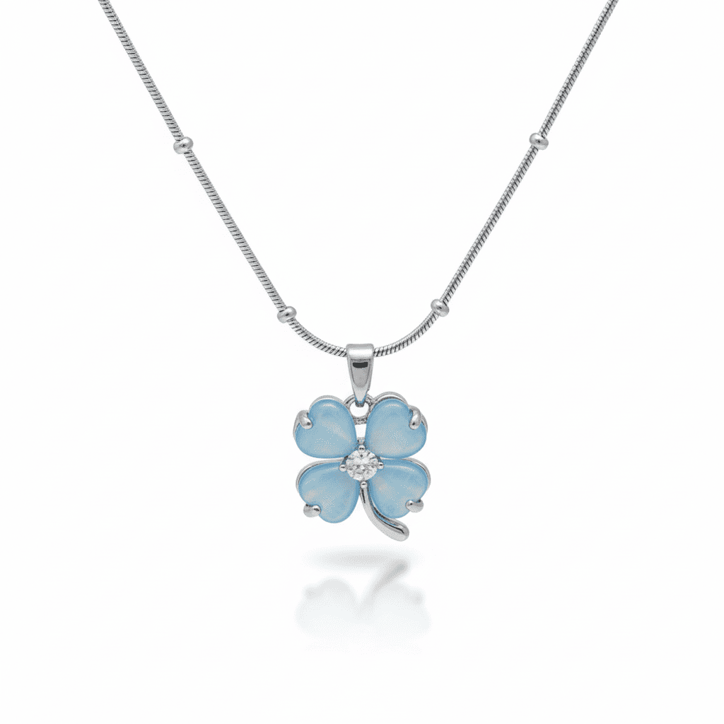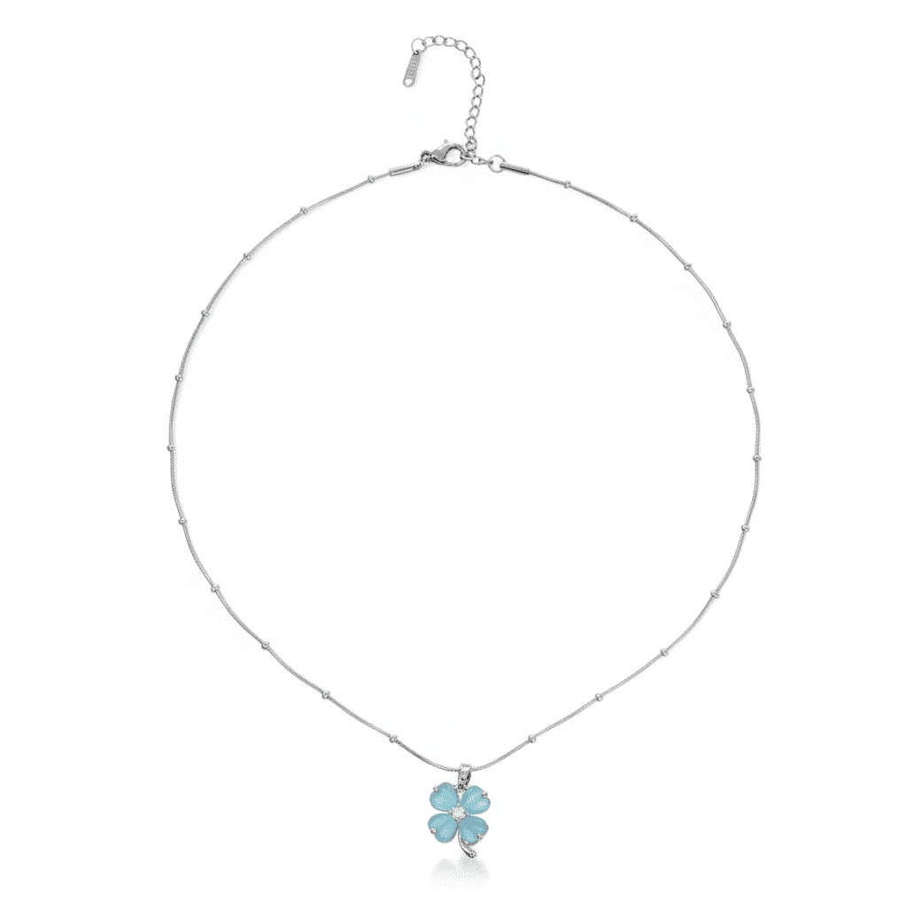 Kadın Çelik Kolye - Toplu Snake Zincirli - Yonca Yaprağı Tasarım - Mavi Mineli - Gümüş Renk