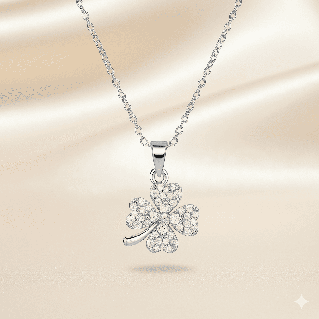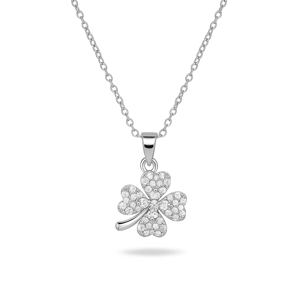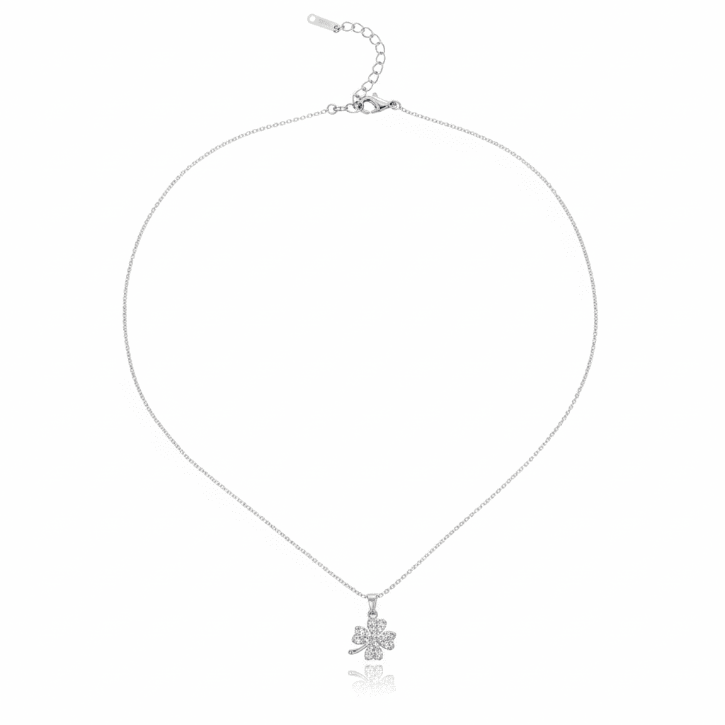 Kadın Çelik Kolye - Yonca Yaprağı Tasarım - Baget Kesim - Beyaz Zirkon Taşlı - Gümüş Renk