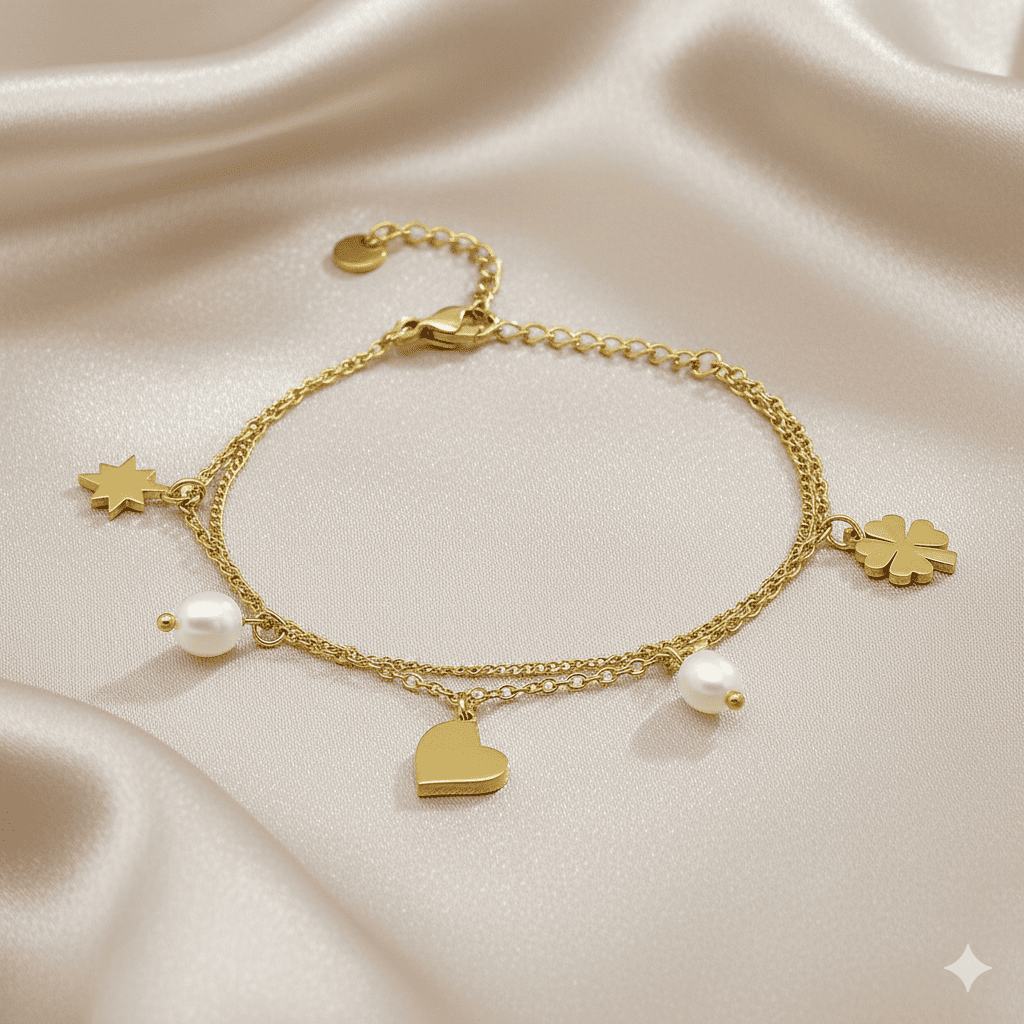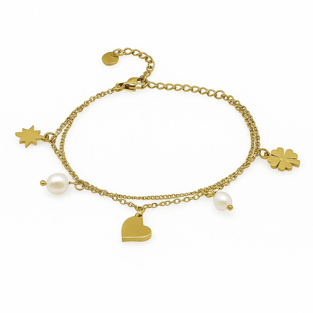 Kadın Çelik Şans Bilekliği - Gurmet Forsa Zincirli - İnci Süslemeli - Altın Renk