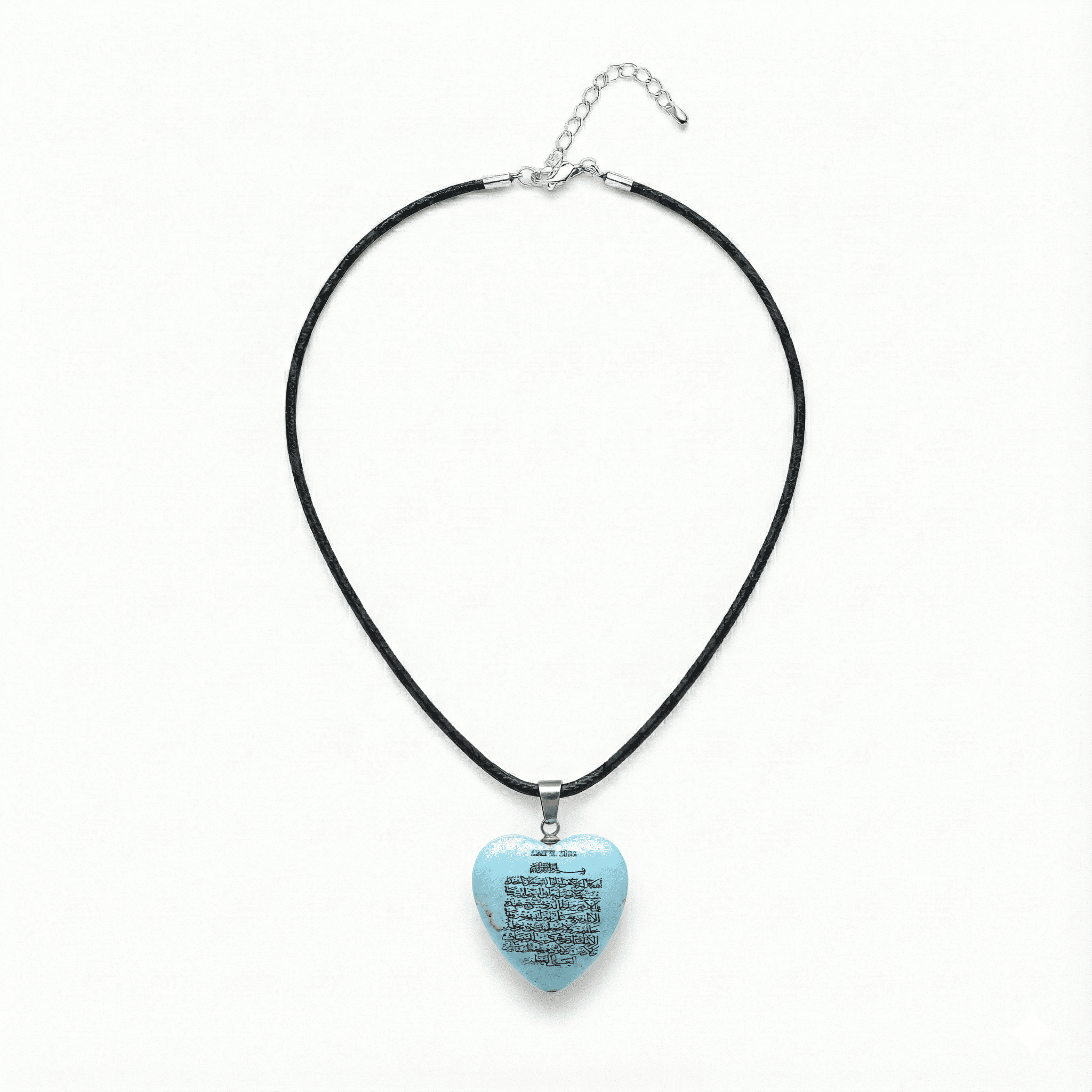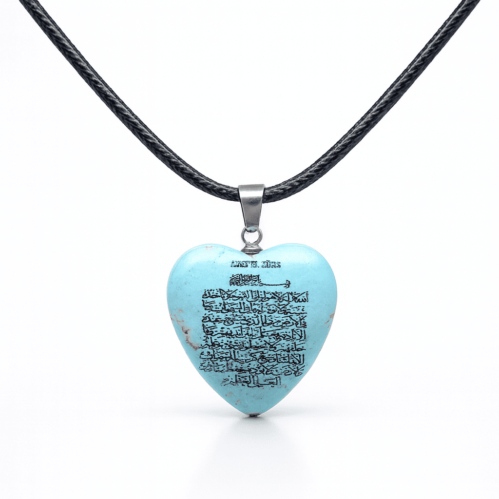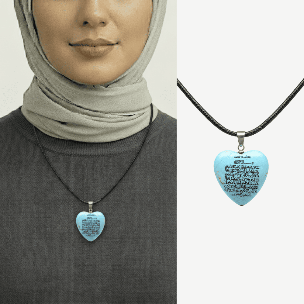 Kadın Firuze Doğaltaş Cevşen Kolye - Üzeri Ayetel Kürsi Yazılı - Kalp Tasarım - Turkuaz Renk